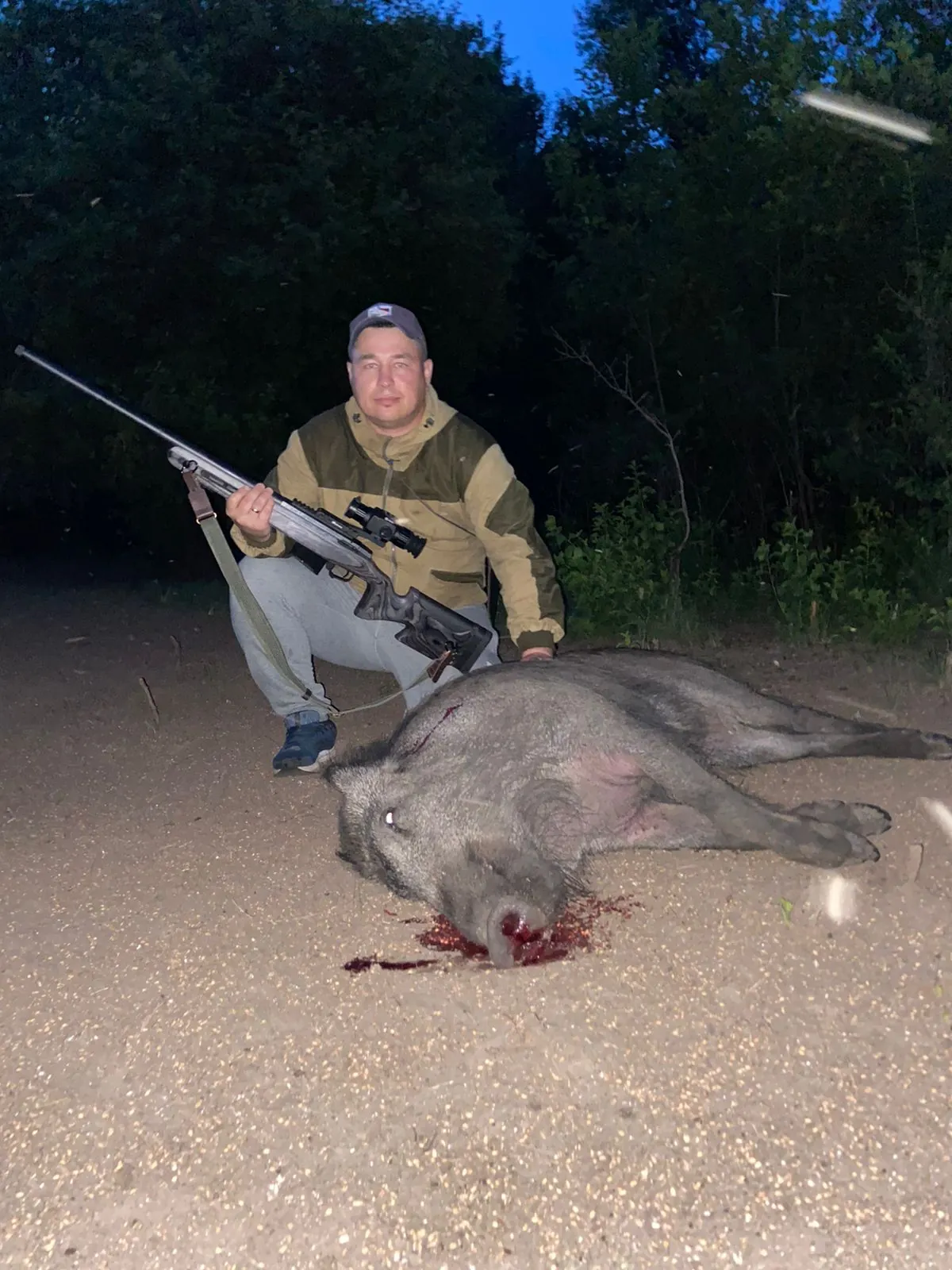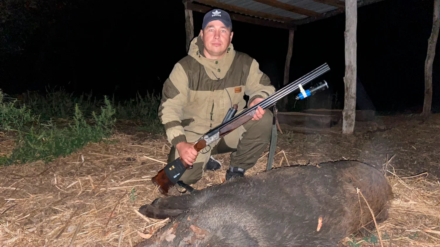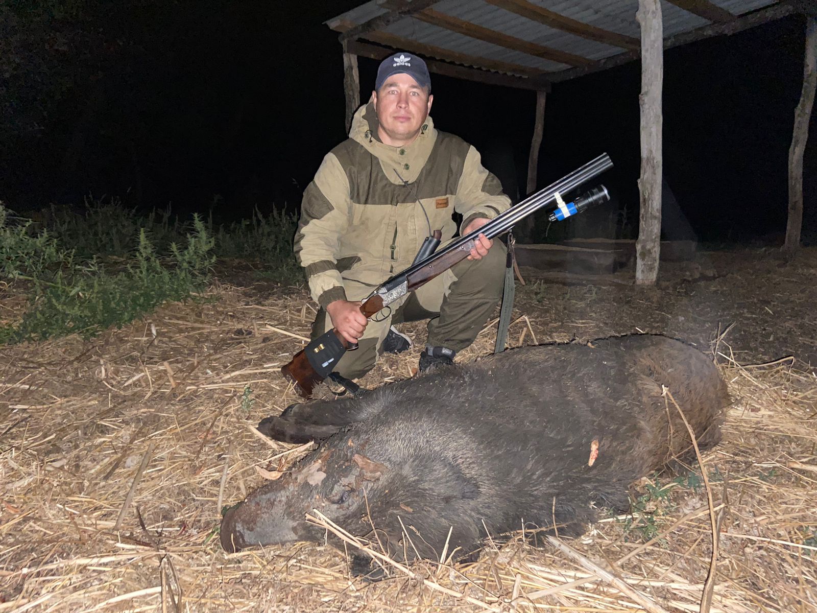 Я тихо подошел к вышке, стал прицеливаться. Егерь подсказал мне, в какого из них лучше стрелять. После нашего обоюдного «зрительного подтверждения» я подождал, когда кабан станет боком, прицелился в лопатку и произвел выстрел. Слышал только звук падающего животного и визг разбегающихся собратьев. Кабан добыт! Но прежде, чем забрать добычу, егерь дает команду перезарядить и наблюдать, чтобы исключить подранка и нападения. Мы постояли еще две минуты и выдвинулись к нему. Подойдя к трофею, я увидел его размеры — он оказался огромным! Чтобы его загрузить, пришлось позвать еще одного егеря.