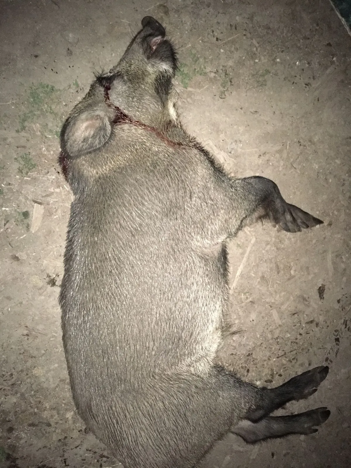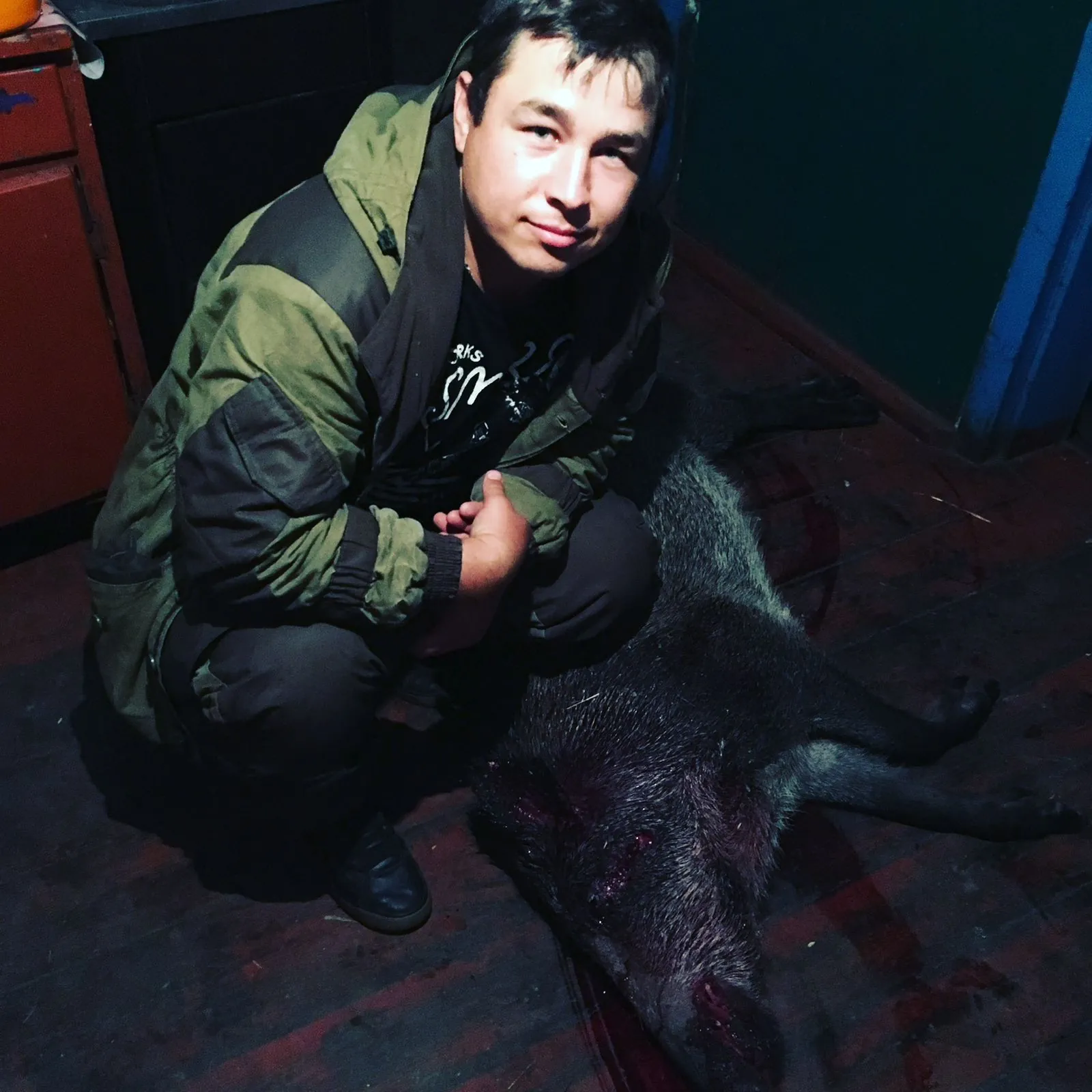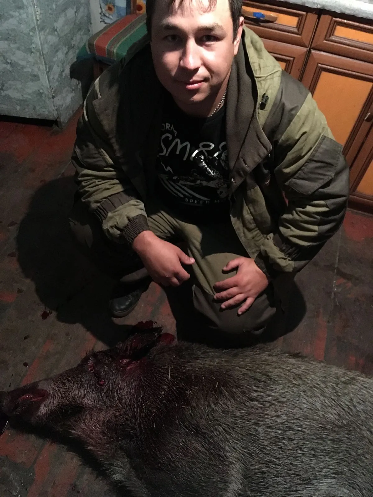 Я тихо подошел к вышке, стал прицеливаться. Егерь подсказал мне, в какого из них лучше стрелять. После нашего обоюдного «зрительного подтверждения» я подождал, когда кабан станет боком, прицелился в лопатку и произвел выстрел. Слышал только звук падающего животного и визг разбегающихся собратьев. Кабан добыт! Но прежде, чем забрать добычу, егерь дает команду перезарядить и наблюдать, чтобы исключить подранка и нападения. Мы постояли еще две минуты и выдвинулись к нему. Подойдя к трофею, я увидел его размеры — он оказался огромным! Чтобы его загрузить, пришлось позвать еще одного егеря.