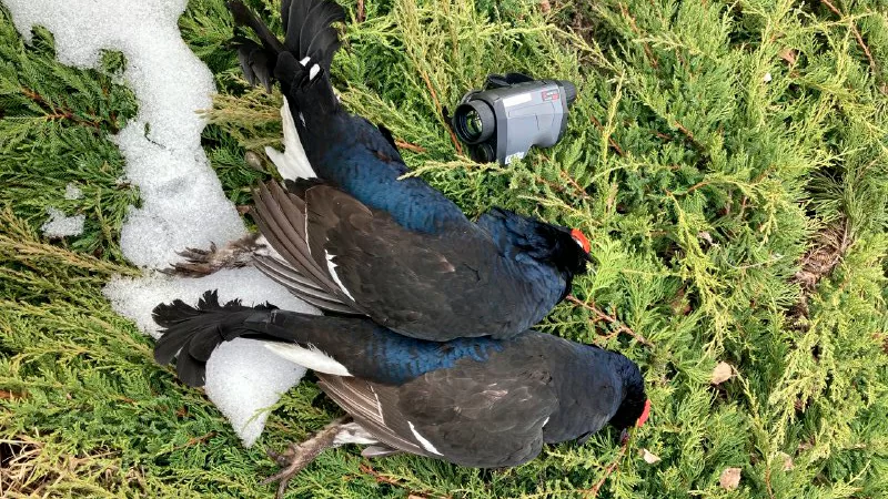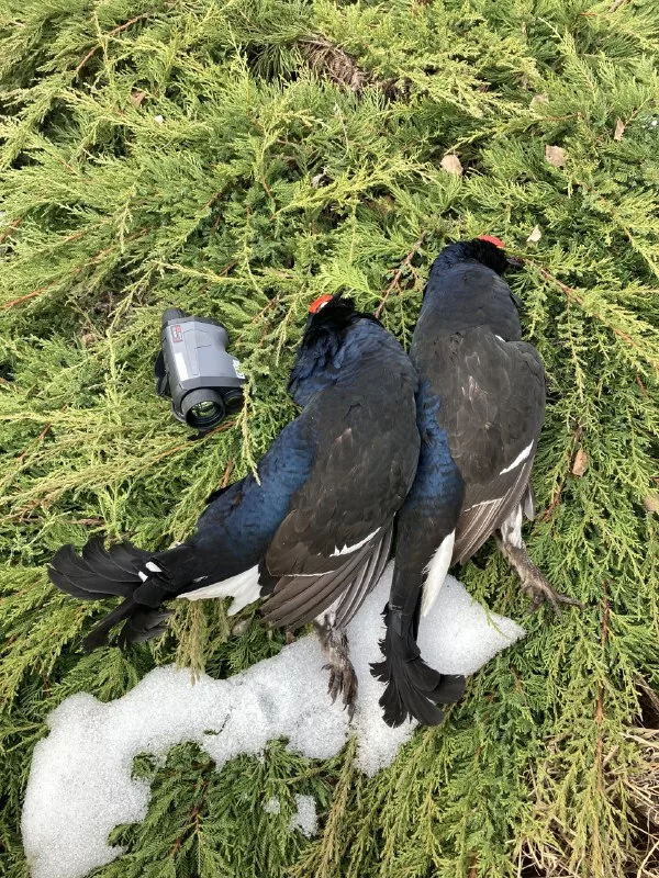 В итоге получилось насчитать 12 токующих особей, что стало бы настоящей проблемой в условиях предрассветных сумерек и ограниченной видимости из шалаша, не будь у меня с собой тепловизионного монокуляра Hikmicro Griphon GQ35. Благодаря функции передачи потокового видео прямо на смартфон, получалось без труда осматривать окружающую местность аккуратно высунув руку с монокуляром в верхний проём шалаша и глядя при этом в заранее пристроенный на еловых ветках смартфон - очень просто и удобно. Особи для добычи были выбраны заранее и биты двумя выстрелами с интервалом около 10 минут. Отличные экземпляры!
