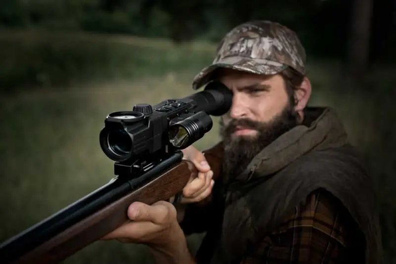 Одним из универсальных вариантов для охоты, как днем, так и ночью производители предложили цифровые прицелы ночного видения. При ярком освещении в дневных условиях оптика работает как обычная видеокамера. Дальность стрельбы с такими устройствами может доходить до 500 метров и более. С наступлением темноты цифровая начинка позволяет максимально усилить сигнал и обеспечить видимостью целей до 800 метров. В отличие от традиционных ПНВ на электронно-оптических преобразователях (ЭОП) цифровая оптика не боится засветок и хорошо работает днем и ночью. Цифровой или оптический прицел будет хорошим вариантом для работы на средних дистанциях. С наступлением темноты увеличить дальность стрельбы помогут инфракрасные осветители, способные пробить темноту на приличное расстояние. Современное оборудование предоставляет качественное изображение удаленных объектов. Электронные визирные сетки, повторяя концепцию, заложенную в дневной оптике с расположением в первой фокальной плоскости дают возможность пользоваться всеми их преимуществами. Это стрельба выносом точки прицеливания и определение расстояния по размерам цели. Оптический или цифровой прицел – прекрасное решение практически для всех типов охот.