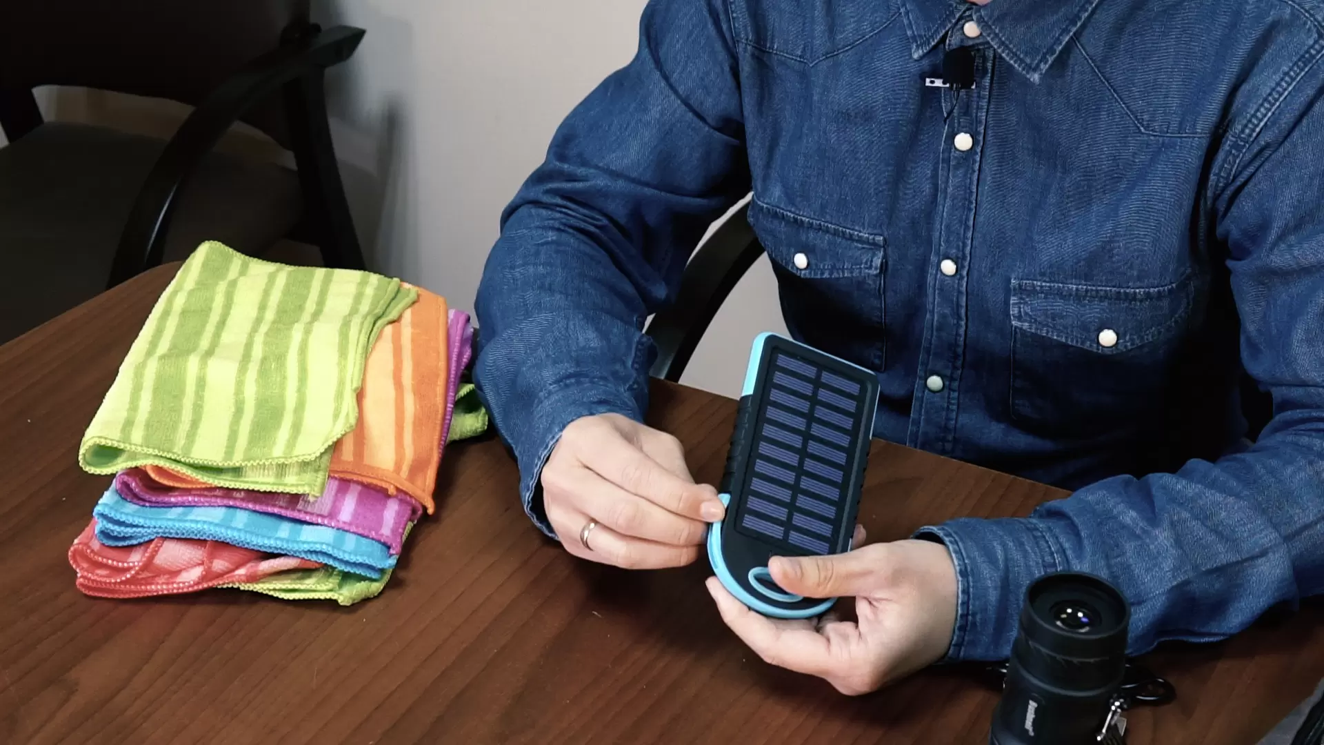 Очень низкого качества рюкзак, дешевый дневной монокуляр с пластиковой оптикой, поддельная солнечная зарядка (вместо солнечной батареи пластик), она уже начала разваливаться, … и набор тряпочек из условной микрофибры. Стоимость всего этого добра вместе, ну наверное, не более 1000 рублей. Мы заплатили почти 4000.