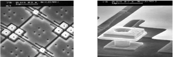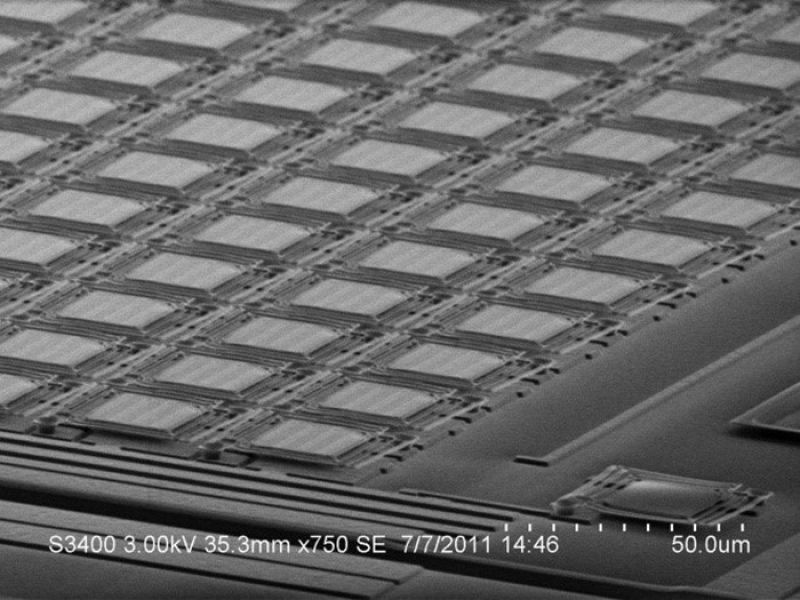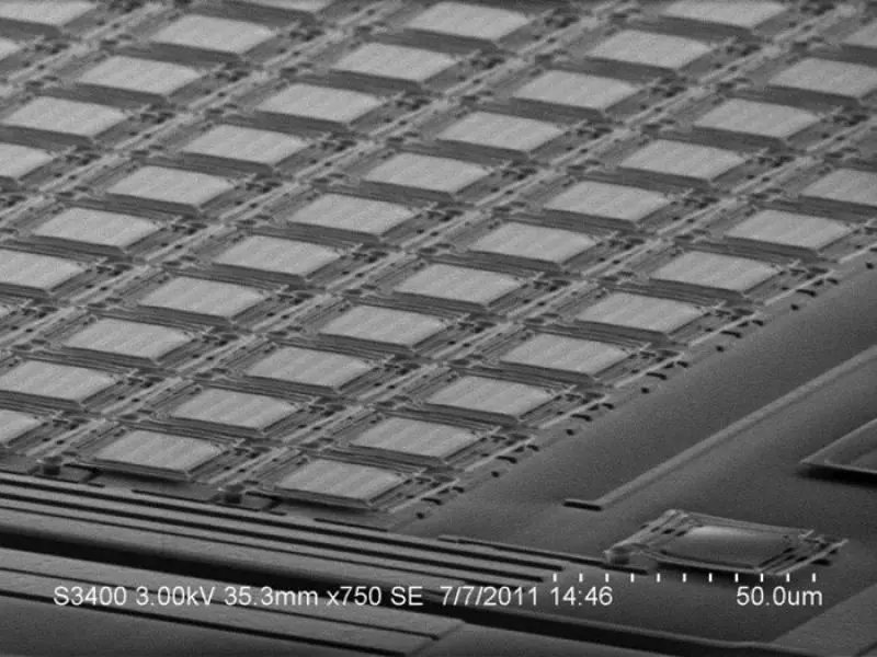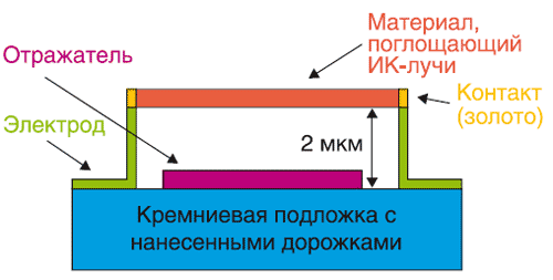 Иными словами, микроболометр это сжатый до минимально возможных размеров набор датчиков. Сегодня размер такого датчика может составлять до 11 микрометров. Особенно восхищает и то, что и у этой микроскопической детали есть еще более мелкие элементы. Элементы микроболометра подвешены на высоте 2,5 мкм. Ширина ножек элемента составляет всего 1,5-1,8 мкм.