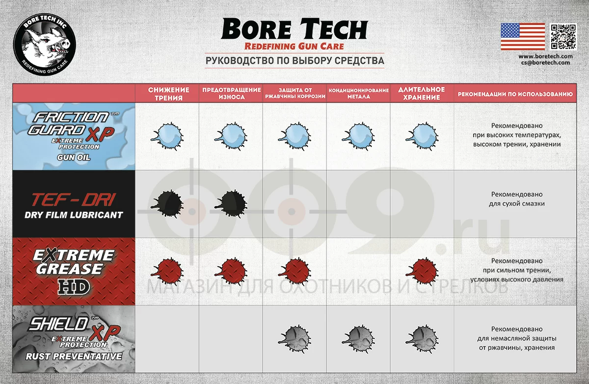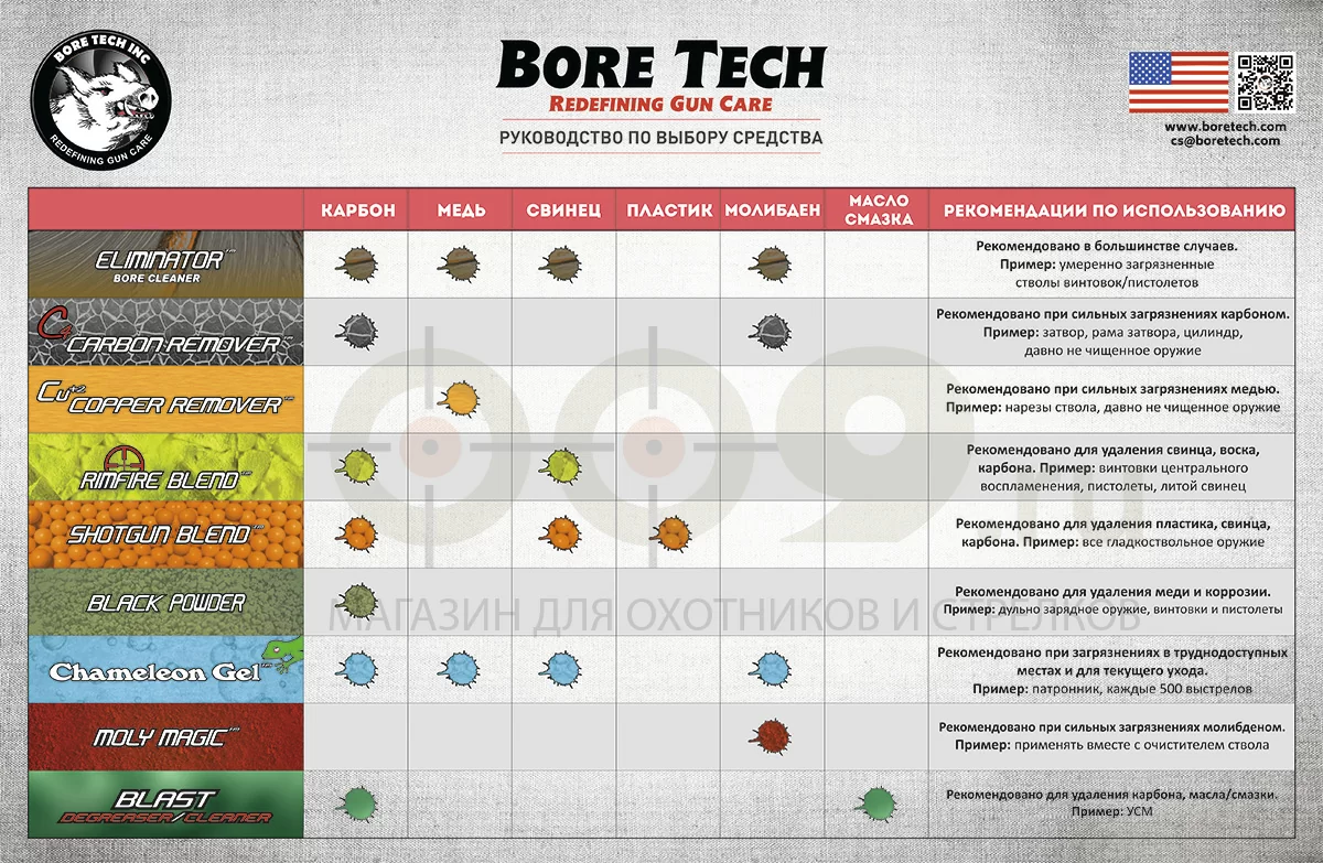 Оружейные масла Bore Tech inc. Главное отличием этих средств от прочих – это отсутствие какого-либо резкого запаха. Никакого аммиака и никакой вони. Можно пользоваться в закрытом помещении.