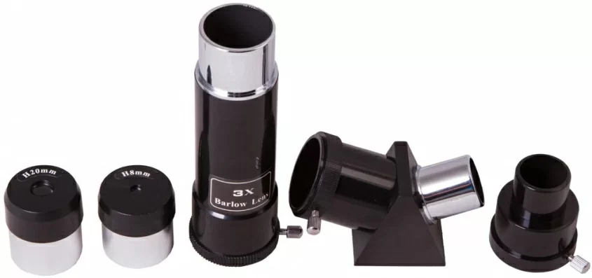 В комплекте с телескопом идет множество аксессуаров – два окуляра, диагональное зеркало, линза Барлоу. Приобретать дополнительные не придется. Максимально увеличение «из коробки» составляет 135 крат. Труба устанавливается на простую азимутальную монтировку, которую можно перемещать по высоте и азимуту. Особых умений и знаний для управления телескопом не требуется. Радует и размер трубы – она почти в два раза короче, чем у большинства других рефракторов.