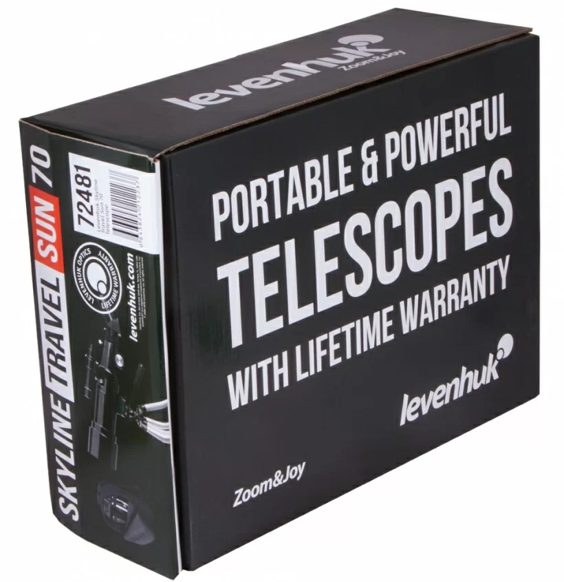 Телескоп Levenhuk Skyline Travel Sun 70 – компактный рефрактор для прогулок и путешествий. Длина его трубы составляет всего 40 см при апертуре 70 мм. В комплект входит удобный фирменный рюкзак, в него легко поместятся телескоп, монтировка, тренога и все необходимые аксессуары. Оптический прибор подойдет для наблюдения планет и спутников, а также деталей ландшафта и архитектуры. В идеальных условиях в него можно рассмотреть большинство объектов из каталога Мессье (без деталей), щель Кассини, кольца Сатурна и Большое Красное Пятно на Юпитере.
