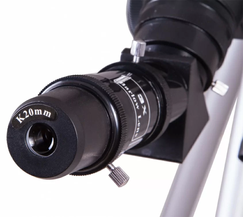 В комплект поставки входит диагональное зеркало, оно строит прямое (неперевернутое) изображение. Благодаря этому телескоп удобен и для наземных наблюдений – он может служить мощной зрительной трубой. В комплекте также идут два окуляра 67x и 20x, линза Барлоу 3x и солнечный фильтр. Максимальное полезное увеличение телескопа составляет 140x. Удобный оптический искатель 5x24 позволяет быстро найти объект наблюдения на ночном небе. С аксессуарами «из коробки» можно получить увеличение 200x.