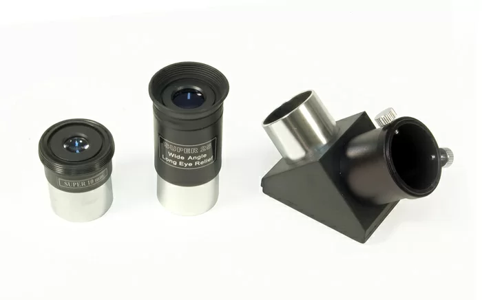 С телескопом поставляются 2 симметричных окуляра, имеющие фокусные расстояния 10 мм и 25 мм и дающие с телескопом увеличение 150 и 60 крат. Линзы окуляров изготовлены из стекла и имеют многослойное просветление. Фокусировка выполняется подвижкой главного зеркала с помощью удобной ручки с плавным ходом. С помощью дополнительных окуляров увеличение телескопа может быть поднято до полезного предела в 250 крат.