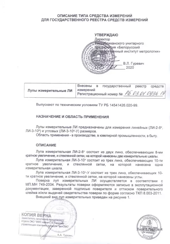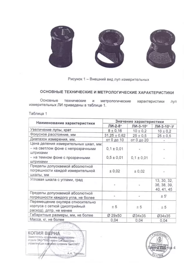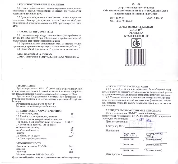 Основное назначение измерительной лупы ЛИ-2-8х Измерительная лупа ЛИ 2-8х оптический прибор, выпущенный ОАО «БелОМО - Минским механическим заводом имени С.И.Вавилова». Лупы измерительные ЛИ-2-8х проходят государственную ПОВЕРКУ и включены в Государственный реестр средств измерений РФ. Оптическая схема лупы состоит из двух линз и имеет увеличение 8х. Две метрические шкалы, длиной 10мм, нанесенные на стеклянную поверхность, имеют цену деления 0,1 и 0,5 мм, и позволяют определять линейные размеры рассматриваемых объектов на плоской поверхности. Оптическая лупа ЛИ 2-8х выполнена в прочном металлическом корпусе, на линзы нанесено просветляющее покрытие, которое сводит к минимуму потери света и обеспечивает получаемое изображение высоким уровнем четкости и контраста. Подготовленные менеджеры нашего интернет-магазина по телефону (495) 989-10-56 могут ответить на все вопросы касательно технических характеристик и возможностей измерительной лупы ЛИ-2-8х. Кроме того, вы можете оставить свой вопрос на сайте, и мы обязательно вам ответим. Основные характеристики лупы измерительной ЛИ-2-8х  Высококачественная оптика с просветляющим покрытием Оптическое увеличение 8х Диоптрийная установка в пределах ± 5 дптр Две шкалы для измерения линейных размеров рассматриваемых деталей/предметов Цена деления на светлом фоне с непрозрачными штрихами - 0,1 мм Цена деления на темном фоне с прозрачными штрихами - 0,5 мм Фокусное расстояние 31 мм Габаритные размеры 36х36х55,5 мм ТУ РБ 14541426.020-99 ГОСТ 25706-83 Государственная ПОВЕРКА Межповерочный интервал 24 месяца. Методика поверки МП.МН 749-2004. Доступна для скачивания в системе "АРШИН". Включены в государственный реестр средств измерений РФ за №62981-21. Срок свидетельства до 22.06.2026г. Производитель - ОАО «БелОМО - Минский механический завод имени С.И.Вавилова»  Сфера применения лупы для измерений ЛИ-2-8х Область применения измерительной лупы ЛИ-2-8х, может быть самой разнообразной: это филателия, нумизматика, ювелирная отрасль, криминалистика. Кроме того, высоко оценить оптические возможности лупы для измерений смогут и банковские работники, проверяя подлинность купюр, любители насекомых, геологи и так далее. Комплект поставки:  Лупа измерительная ЛИ-2-8x - 1 шт. Этикетка - 1 экз. Коробка -1 шт.  Технические характеристики лупы для измерений ЛИ-2-8х    Основные ТТХ   Лупа измерительная ЛИ-2-8x    Материал Стекло, металл   Физические и эксплуатационные характеристики   Увеличение, крат  8,0 ± 0,16   Линейное поле зрения, мм 14   Фокусное расстояние. мм   31,25 ± 0,62   Цена деления измерительных шкал на светлом фоне с непрозрачными штрихами, мм   0,1 ± 0,01   Цена деления на темном фоне с прозрачными штрихами, мм  0,5 ± 0,01   Перемещение окуляра относительно корпуса с сеткой (диоптрийный расход), не менее, дптр.  ± 5   Пределы абсолютной погрешности каждой измерительной шкалы, мм   ± 0,02   Масса, кг  0,04   Габаритные размеры, не более, Ø мм  29×50   Габариты в упаковке, мм  36х36х55,5   Производитель может вносить изменения в комплектацию, конструкцию и/или программное обеспечение прибора без предварительного уведомления пользователей