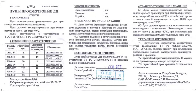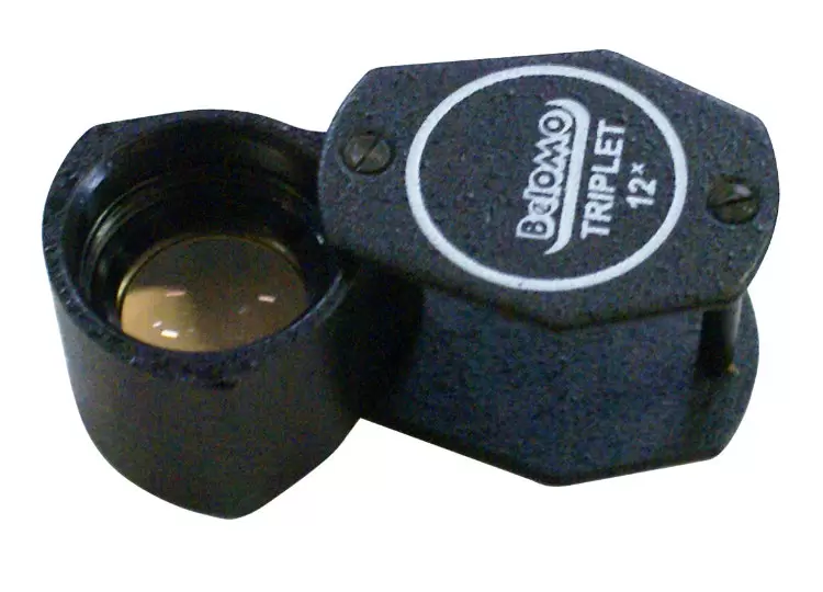 Назначение Компактная просмотровая лупа БелОМО ЛП-3-12x предназначена для 12-кратного увеличения мелких предметов и деталей. Может использоваться для осмотра небольших ювелирных изделий, изучения и сравнения слов печатного или рукописного текста, увеличения монет или насекомых, исследования тканевых волокон.Параметры и функцииКратность 12xФокусное расстояние - 22 ммПоле зрения, линейное - 9 мм3 апланатичные ахроматические линзыМногослойное просветляющее покрытиеМеталлические оправа и крышкаКомпактная конструкция, вес 60 гРабочие температуры -45°C...+45°CОсобенности конструкции и использованияОптическая часть — комбинация из 3 апланатических ахроматических стеклянных линз (триплет). Такая оптическая конструкция исправляет сферические аберрации третьего порядка и первичный хроматизм: точечные изображения сохраняют размер и форму, не превращаясь в круги или диски, а у предметов не появляются «лишние» оттенки и цветные контуры. Многослойное просветление линз уменьшает потери света при отражении и улучшает контраст картинки. Увеличенное изображение максимально приближено к оригинальному, видимому без лупы.Складная лупа ЛП-3-12x (БелОМО) 12-кратного увеличения выполнена в металлической оправе с крышкой. В раскрытом виде крышка служит удобной ручкой, а в сложенном — полностью закрывает линзы, защищая от царапин и пыли. За счёт небольших размеров и малого веса (60 г) лупу можно постоянно носить с собой.Модель изготовлена по ГОСТ 25706-83 и ТУ РБ 075269946.072-94, подходит для работы при дневном или искусственном освещении при температуре от -45°С до +45°С. Комплектация:Лупа ЛП-3-12xЭтикеткаУпаковочная коробкаЧтобы купить ручную, измерительную или ювелирную просмотровую лупу, приезжайте в наш московский офис-склад, оформляйте заказ в интернет-магазине или по телефону +7 (800) 200-14-82. Технические характеристики    Основные ТТХ   Лупа просмотровая ЛП-3-12x     Материал  Стекло, металл.    Физические и эксплуатационные характеристики    Увеличение, крат  12    Линейное поле зрения ,мм   9    Фокусное расстояние, мм  21,65 - 22,19    Диапазон рабочих температур. °С   от +1 до + 40     Масса, гр   0,06    Габариты в сложенном положении, мм   36×28×25    Производитель может вносить изменения в комплектацию, конструкцию и/или программное обеспечение прибора без предварительного уведомления пользователей
