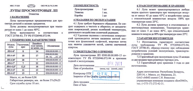 Основное назначение просмотровой лупы ЛП-3-15x Основным назначением трехлинзовой просмотровой лупы ЛП-3-15x является детальный просмотр мелких предметов, которые плохо различимы глазом. Оптические элементы лупы изготовлены из высококачественного стекла с многослойным просветляющим покрытием. Три апланатические, цветокорректирующие, ахроматические линзы позволяют получить четкое и высококонтрастное изображение рассматриваемого предмета. Компактные размеры, и высокая разрешающая способность делают складную лупу ЛП 3-15 прекрасным инструментом не только в руках любителей, но и специалистов в области филателии, нумизматики, макрофотографии, геологии и т.д. Сфера применения трехлинзовой лупы ЛП-3-15x Оптические возможности, которыми обладает карманная лупа ЛП-3-15х, позволяют применять ее в самом широком спектре наблюдений, а именно: при изучении драгоценных камней и ювелирных изделий, распознавании горных пород и полезных ископаемых, при увеличении печатных текстов, монет, осмотре мелких частей механизмов, обследовании волокон тканей т.д. Менеджеры нашего интернет-магазина могут проконсультировать вас по всем вопросам касательно возможностей и технических характеристик просмотровой лупы ЛП-3-15x. Позвоните нам по телефону (495) 989-10-56 или оставьте свой вопрос на сайте и мы обязательно вам ответим. Основные характеристики лупы просмотровой ЛП-3-15x Высококачественная оптика Просветляющее покрытие Оптическое увеличение 15x Фокусное расстояние 17 мм Линейное поле зрения 9 мм Габаритные размеры 36×28×25 мм Масса 0,05 кг Диапазон рабочих температур от +1 до + 40 °С Лупа изготовлена в соответствии с ГОСТ 25706-83, ТУ РБ 075269946.072-94 Производитель ОАО «БелОМО - Минский механический завод имени С.И.Вавилова» Комплект поставки: Лупа просмотровая ЛП-3-15x - 1 шт Этикетка - 1 экз. Коробка -1 шт Технические характеристики трехлинзовой просмотровой лупы ЛП-3-15x Основные ТТХ Лупа просмотровая ЛП-3-15x Материал Стекло, пластик Физические и эксплуатационные характеристики Увеличение, крат 15 Линейное поле зрения ,мм 9 Фокусное расстояние, мм 17,28 - 17,65 Диапазон рабочих температур. °С от +1 до + 40 Масса, гр 0,05 Габариты в сложенном положении, мм 36×28×25 Производитель может вносить изменения в комплектацию, конструкцию и/или программное обеспечение прибора без предварительного уведомления пользователей