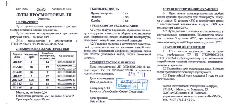 Основное назначение просмотровой лупы ЛП-4-20x ЛП-4-20x - четырехлинзовая просмотровая лупа с 20-ти кратным увеличением и фокусным расстоянием 11-13 мм. Компактные размеры и прекрасные оптические возможности, которыми обладает карманная лупа ЛП-4-20x, делают ее прекрасным инструментом при детальном изучении мелких предметов. В оптической схеме применены апланатические, ахроматические линзы, позволяющие получать изображение увеличенного предмета с высоким уровнем контраста и четкости. Менеджеры нашего интернет-магазина могут ответь на все вопросы касательно оптических возможностей и технических характеристик просмотровой лупы ЛП 4-20x. Позвоните нам по телефону (495) 989-10-56 или оставьте свой вопрос на сайте и мы обязательно вам ответим. Сфера применения просмотровой лупы ЛП-4-20x Просмотровая лупа ЛП 4-20 - прекрасный оптический инструмент для применения в ювелирной отрасли, геологии, ботанике, криминалистике, нумизматике и т.д. Оптические возможности, которыми обладает складная лупа ЛП 4-20, помогут отраслевым специалистам при детальном изучении ювелирных изделий, драгоценных камней, механизмов часов. Также высоко оценят возможности просмотровой лупы геологи при распознавании горных пород и исследовании полезных ископаемых и т.д. Основные характеристики лупы просмотровой ЛП-4-20x  Высококачественная стеклянная оптика с просветляющим покрытием Оправа и крышка из металла Оптическое увеличение 20х Фокусное расстояние 11-13 мм Линейное поле зрения 7 мм Габаритные размеры 36×28×25 мм Масса 0,06 кг Диапазон рабочих температур от +1 до + 40 °С Срок службы - 10 лет Лупа изготовлена в соответствии с ГОСТ 25706-83, ТУ РБ 075269946.072-94 Производитель ОАО «БелОМО - Минский механический завод имени С.И.Вавилова»  Комплект поставки:  Лупа просмотровая ЛП-4-20x - 1 шт Этикетка - 1 экз. Коробка -1 шт  Технические характеристики просмотровой лупы ЛП-4-20x    Основные ТТХ   Лупа просмотровая ЛП-4-20x     Материал Стекло, пластик   Физические и эксплуатационные характеристики   Увеличение, крат  20   Линейное поле зрения ,мм  7   Фокусное расстояние, мм 11,88 - 13,13   Диапазон рабочих температур. °С  от +1 до + 40    Масса, гр  0,06   Габариты в сложенном положении, мм  36×28×25   Производитель может вносить изменения в комплектацию, конструкцию и/или программное обеспечение прибора без предварительного уведомления пользователей