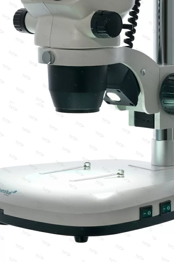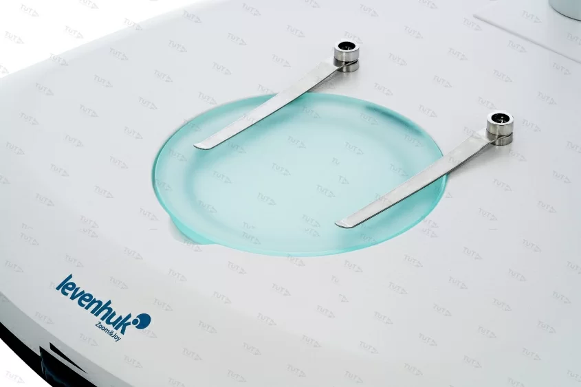 Для освещения образцов применяется классическая светодиодная подсветка. Один светодиод расположен в верхней части, второй – в нижней. Это позволяет изучать образцы разной степени прозрачности. Яркость подсветки можно регулировать. Для питания используется сеть переменного тока.