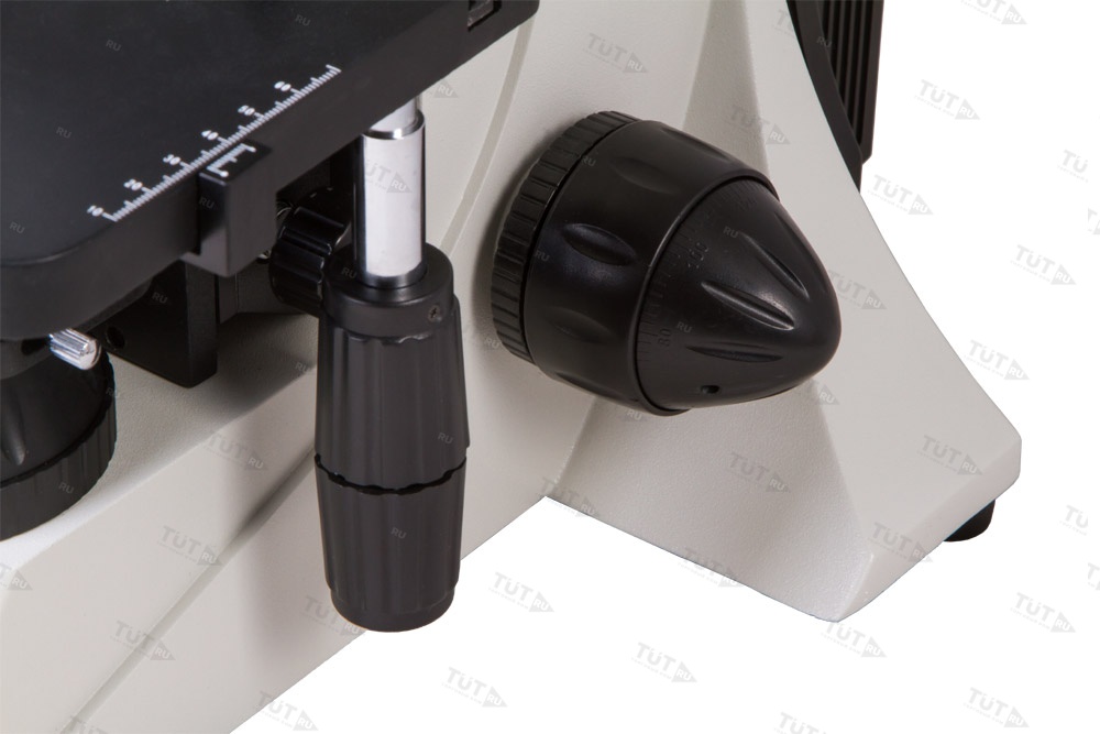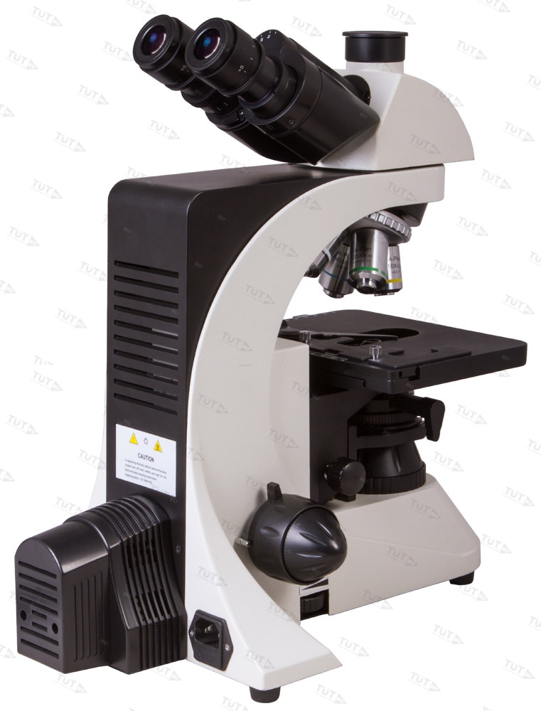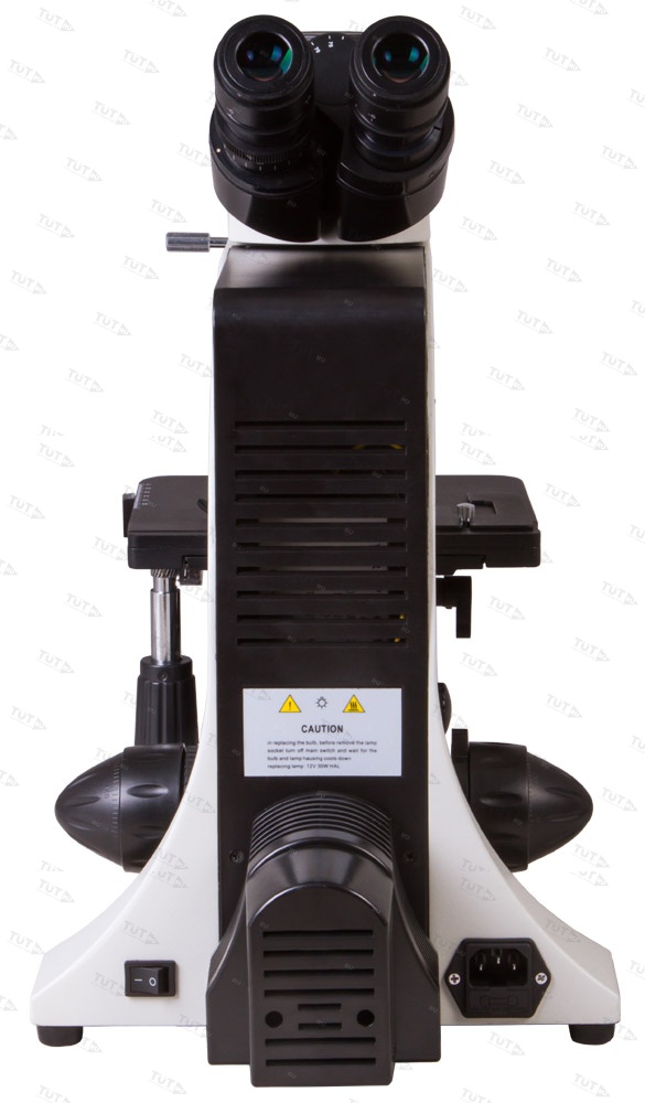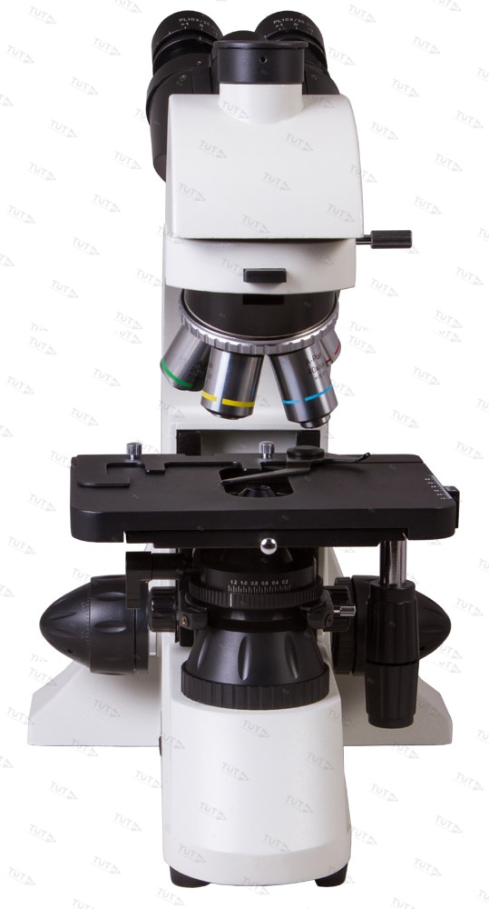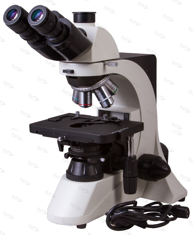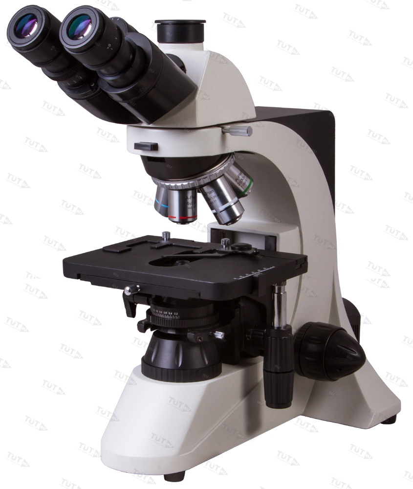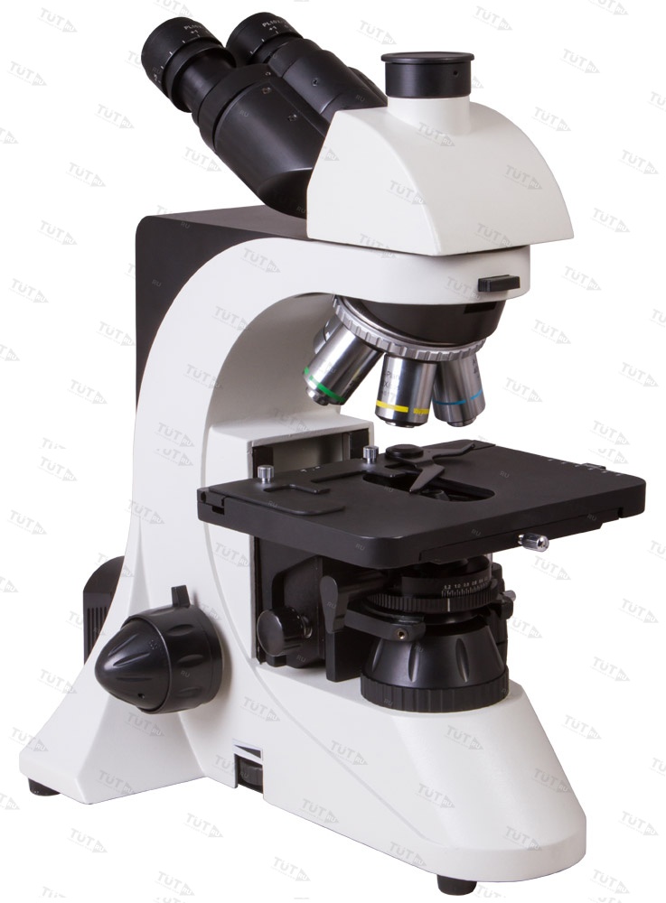 Тринокулярная насадка позволяет одновременно вести визуальные наблюдения и записывать исследования при помощи цифровой камеры. Камера (в комплект поставки не входит) устанавливается в отдельную окулярную трубку, расположенную вертикально. Визуальная часть наклонена под углом в 30°, что позволяет вести длительные наблюдения без перенапряжения мышц шеи. В револьверное устройство установлены планахроматические объективы – они создают плоское поле зрения, не вносят искажений в изображение, радуют высокой детализацией и контрастностью. Широкопольные окуляры позволяют работать даже с протяженными образцами. Грубая и точная фокусировки помогают точно настроить резкость картинки в любых условиях наблюдений.