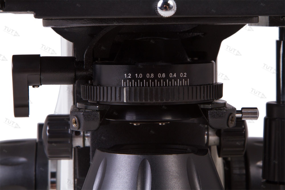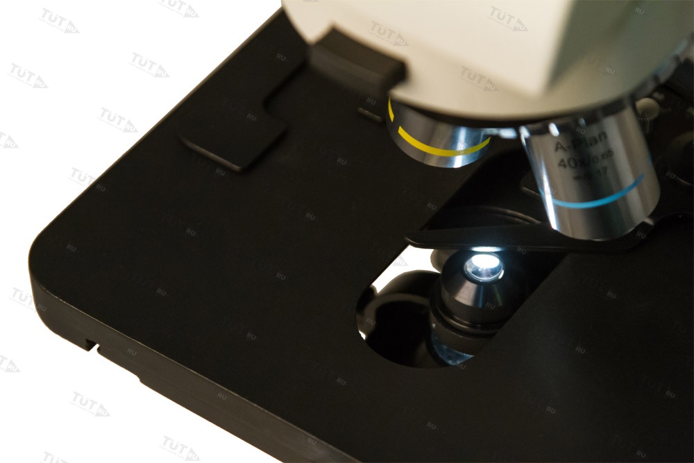 Под предметным столиком с препаратоводителем расположен центрируемый конденсор Аббе с ирисовой диафрагмой. Еще ниже находится галогенная подсветка, яркость которой можно регулировать. Для питания подсветки используется сеть переменного тока – адаптер включен в комплект поставки.