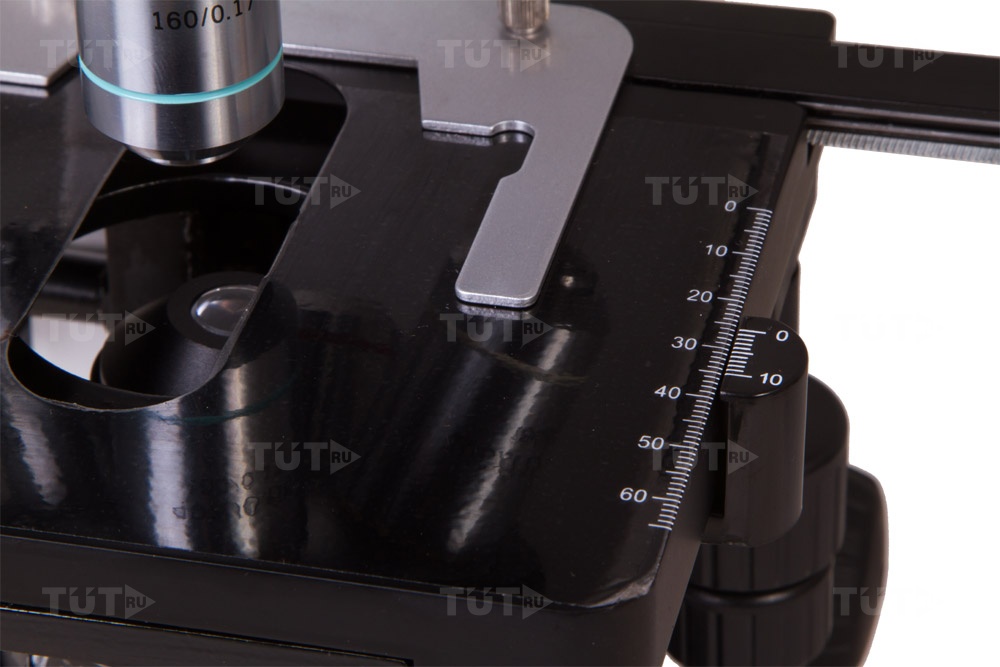 Для размещения образцов используется классический двухкоординатный механический столик. Под ним расположена светодиодная подсветка, ее яркость можно регулировать. Подсветка работает от сети переменного тока. В систему освещения входит также конденсор Аббе с ирисовой диафрагмой и синим фильтром.