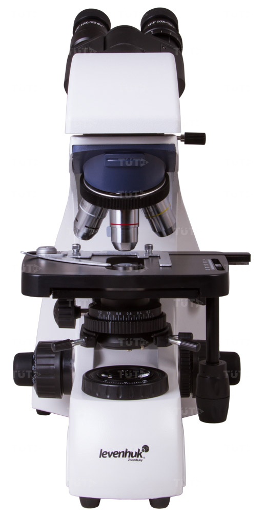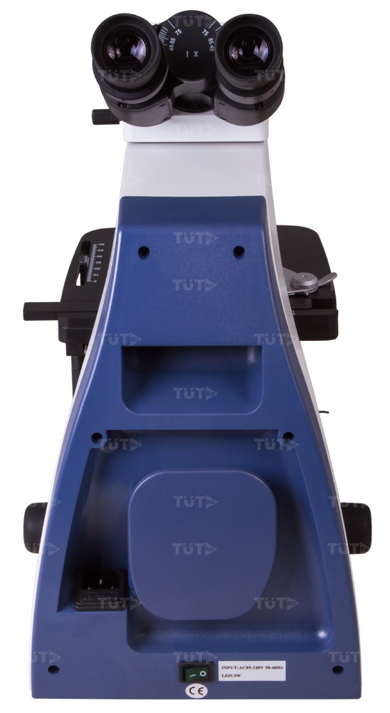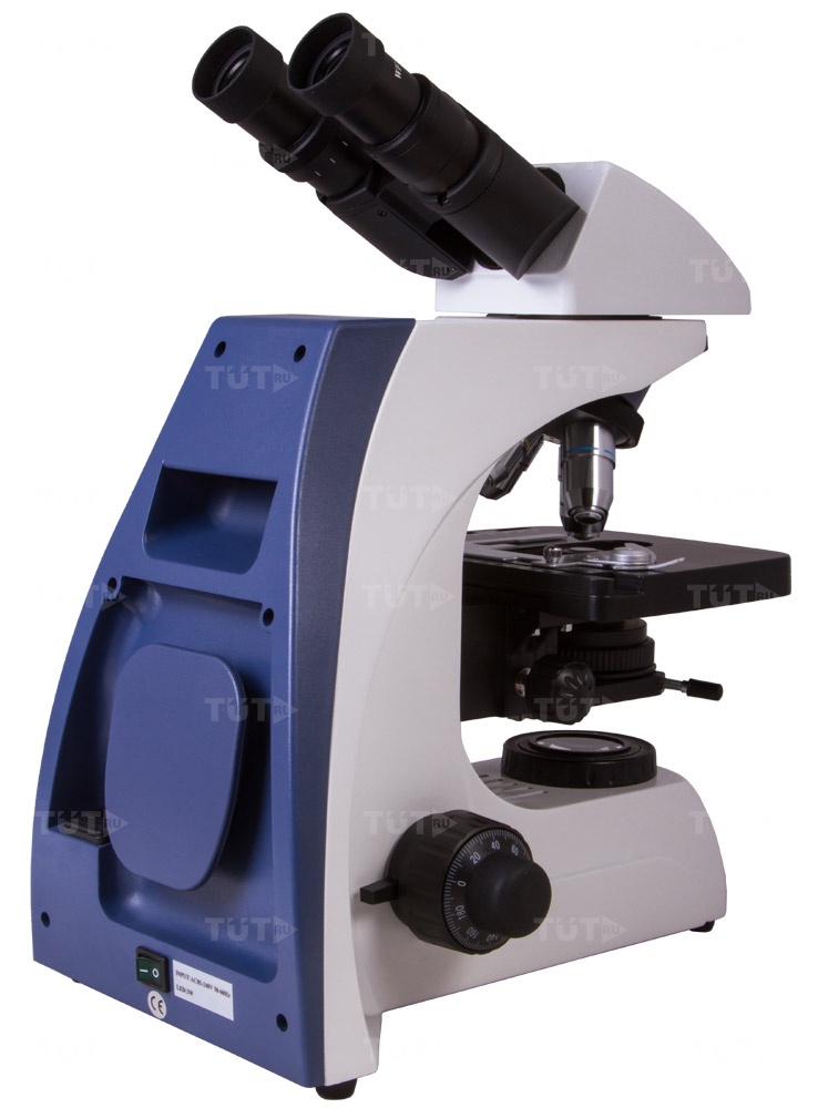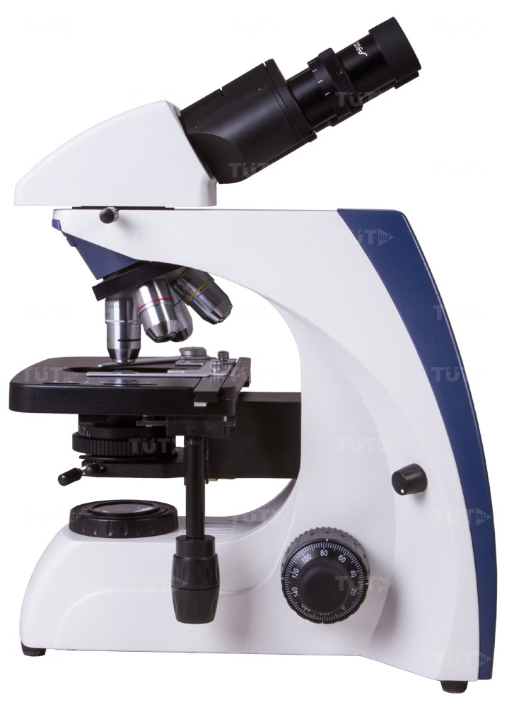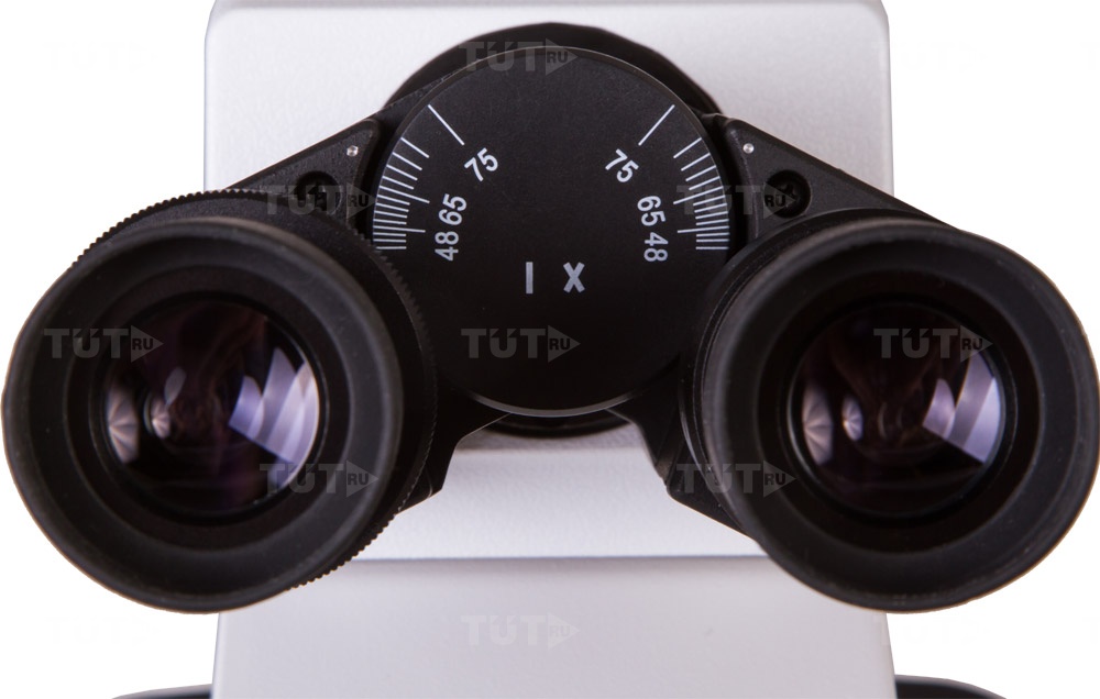 Бинокулярная насадка наклонена под углом в 30°, поэтому длительные исследования не приводят к излишней усталости мышц шеи. За фокусировку отвечают коаксиальные ручки грубой и точной настройки. Широкопольные окуляры дают хороший обзор, а 100-кратный объектив подходит для применения масляной иммерсии.