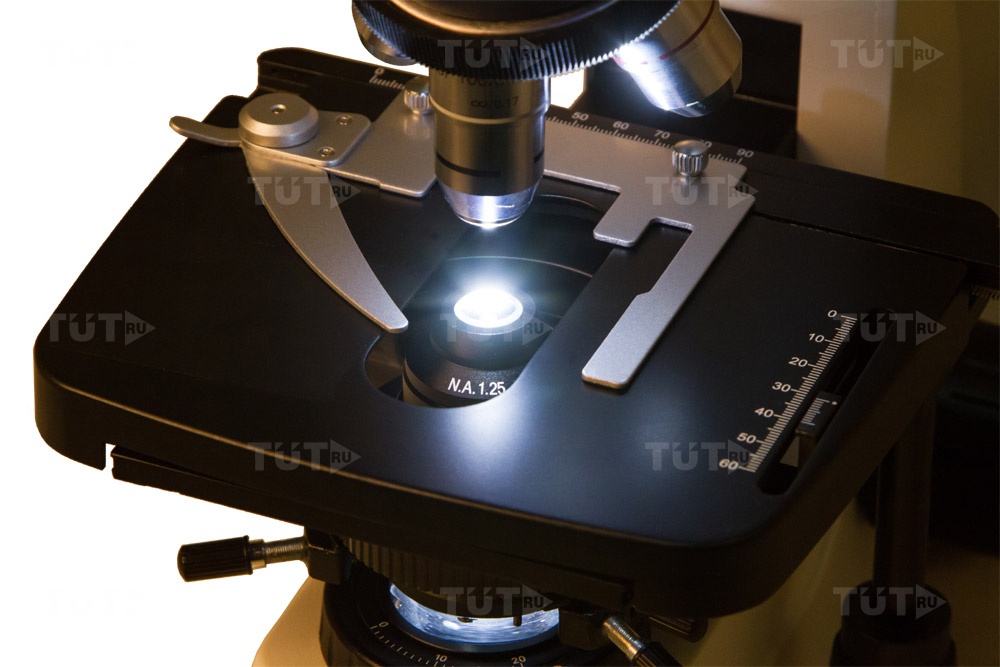 Микропрепараты фиксируются на механическом предметном столике с препаратоводителем. Под ним расположен центрируемый конденсор Аббе со сдвижным кольцом для фильтра. Еще ниже – светодиодная подсветка мощностью 3 Вт, яркость которой можно регулировать. Для работы подсветки требуется постоянное подключение к сети переменного тока (адаптер в комплекте).