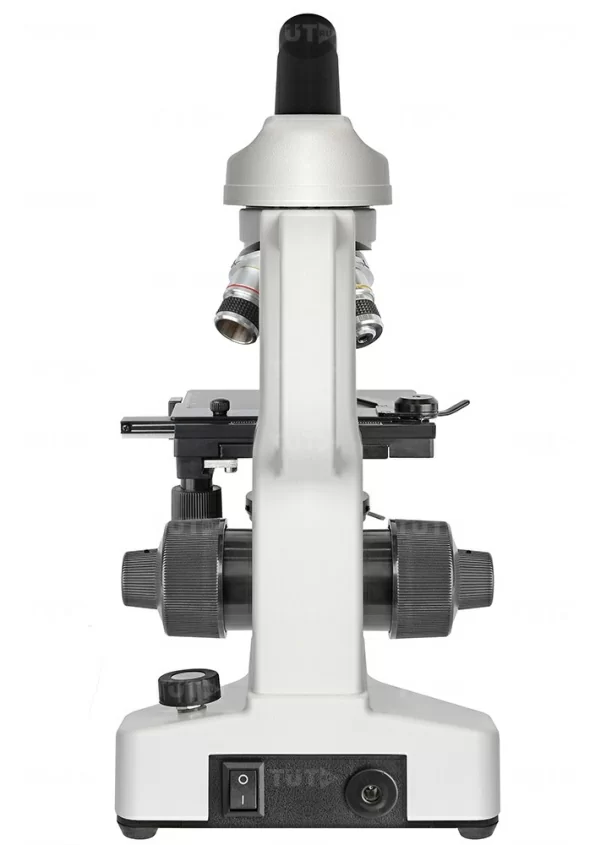Оптическая схема микроскопа состоит из монокулярной насадки и револьверного устройства на 3 объектива. Насадка вращается на 360°, поэтому микроскоп удобно использовать при групповых наблюдениях. Револьверное устройство вращается легко, смена объектива позволяет быстро выбрать оптимальное для наблюдений увеличение. Прямо под объективами расположен предметный столик с препаратоводителем. Образцы для исследований необходимо размещать прямо на нем. Система освещения – это нижняя светодиодная подсветка и конденсор Аббе с ирисовой диафрагмой и держателем фильтра.