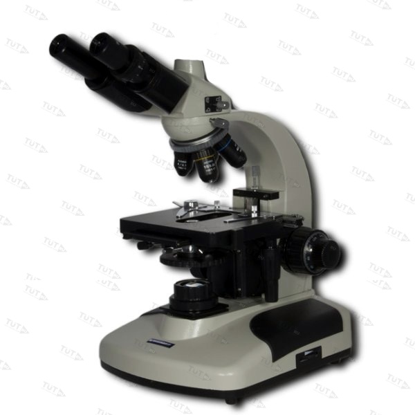 Револьверное устройство вмещает четыре объектива, два из них – с пружинящей оправой. Предметный столик снабжен измерительной шкалой и перемещается по вертикали и горизонтали. Фокусировку можно проводить с точностью до 0,002. Под столиком расположен классический конденсор Аббе со светофильтрами, еще ниже – галогенная подсветка с регулировкой яркости. Питание подсветки – от сети, шнур питания идет в комплекте. Есть возможность настроить освещение по Келлеру.