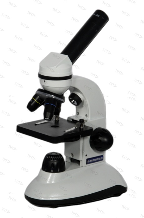 Револьверная головка на три объектива позволяет быстро переключаться между различными увеличениями без переустановки объективов. Монокулярная насадка наклонена на 45 градусов для удобства наблюдений. Освещение препарата производится встроенным светодиодным осветителем 1 Вт.