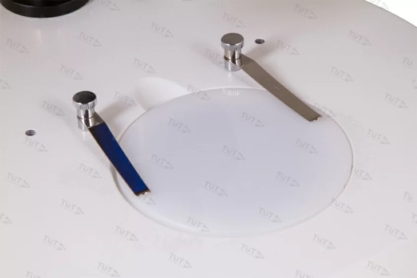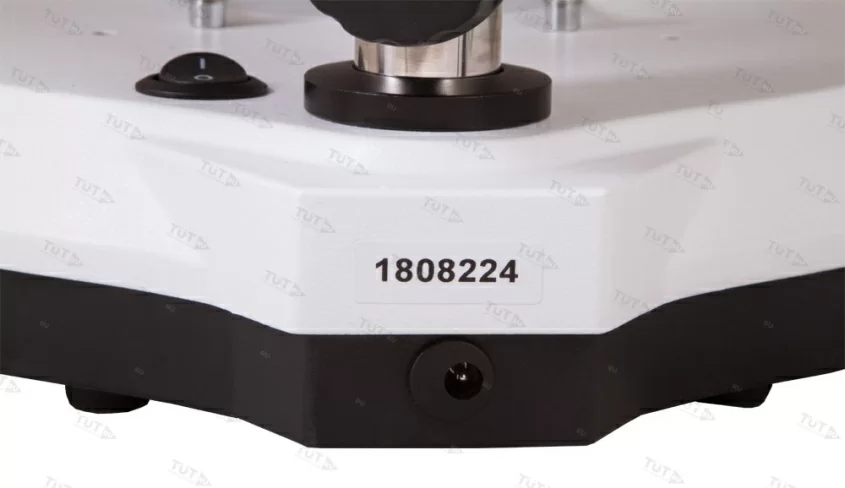 Образцы для исследований фиксируются на предметном столике. В этом микроскопе он представляет собой пластину – черно-белую или матовую стеклянную. Пластины меняются в зависимости от методов наблюдения. Стоит отметить систему освещения. Она состоит из двух независимых галогенных ламп, расположенных по разные стороны от предметного столика. Их можно включать одновременно или по отдельности. Подсветка работает от сети переменного тока (сетевой адаптер включен в комплект поставки).