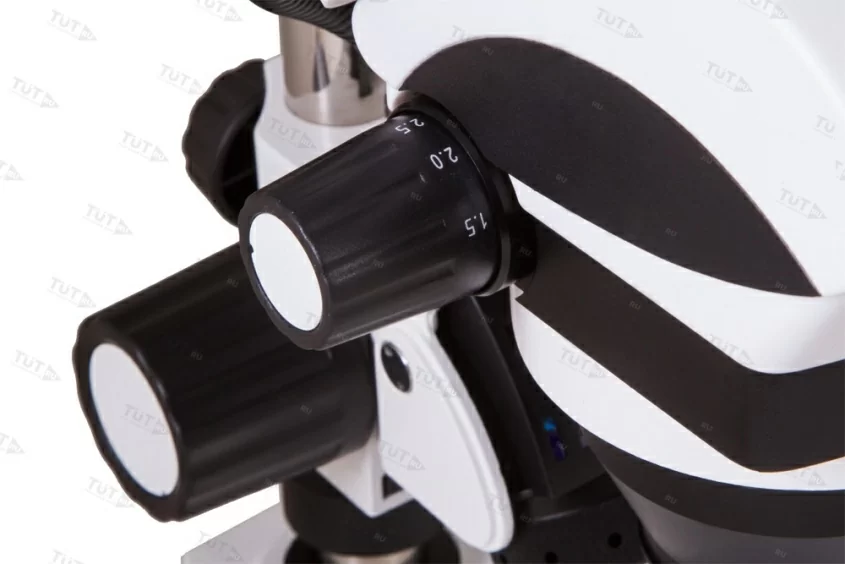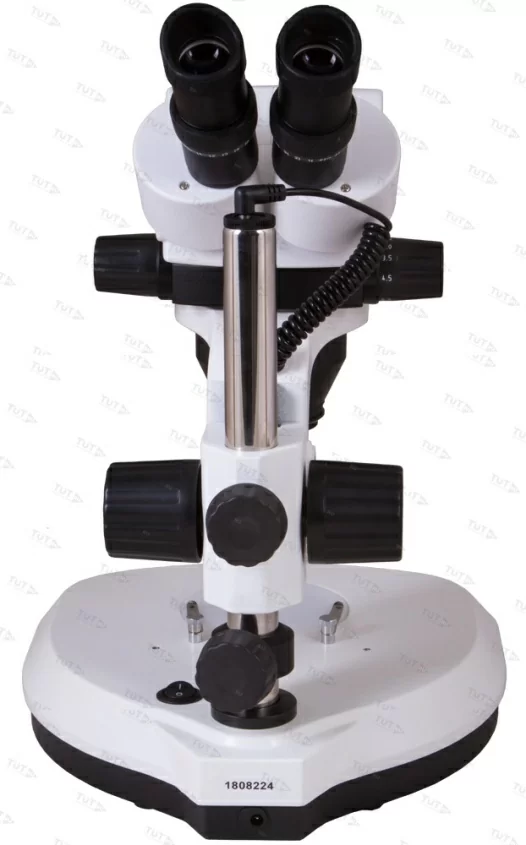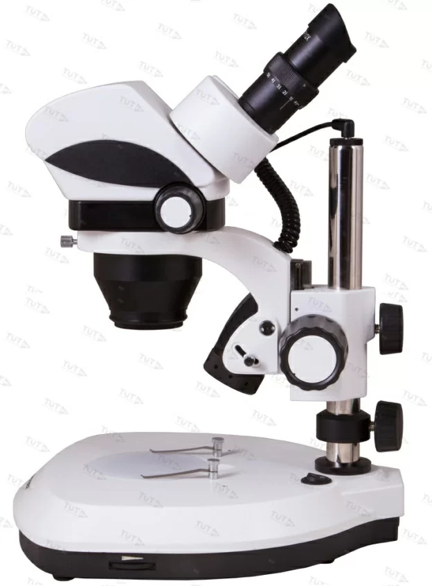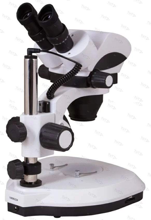 Бинокулярная насадка дает возможность вести наблюдения сразу двумя глазами – это снижает нагрузку на зрение и позволяет работать с микроскопом длительное время, не испытывая усталости. Окуляры снабжены резиновыми наглазниками и кольцами диоптрийной коррекции. Окулярная насадка установлена на штатив, ее можно перемещать по вертикали, отдаляя или, наоборот, приближая к микропрепарату. При групповых исследованиях незаменимой функцией станет возможность разворота насадки на 360°. Увеличение панкратического объектива регулируется отдельной ручкой. Общая кратность микроскопа находится в диапазоне от 7 до 45 крат.