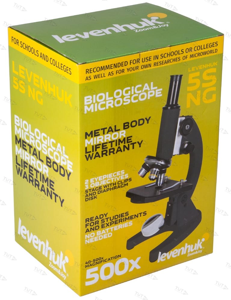 Микроскоп Levenhuk 5S NG – оптический прибор начального уровня, который можно использовать для учебы или научного хобби. Он прекрасно подойдет для ребенка или ученика младшей или средней школы. С помощью Levenhuk 5S NG можно выполнять лабораторные работы по биологии, проводить научные эксперименты в стенах дома, исследовать микромир. Микроскоп обеспечивает увеличение до 500 крат, на котором прекрасно видны простейшие одноклеточные. Этой кратности хватит и для изучения готовых микропрепаратов. Микроскоп Levenhuk 5S NG – это простой, надежный и безопасный оптический прибор. Для освещения образцов в нем используется подсветка в виде зеркала. Она не требует питания, ее не нужно подключать к сети, поэтому ребенок будет избавлен от контакта с электричеством. Юного исследователя можно оставить с таким оптическим прибором наедине, не опасаясь за его безопасность. Для регулировки интенсивности освещения используется диск с диафрагмами. Все оптические элементы микроскопа сделаны из стекла и помещены в прочный металлический корпус. Револьверное устройство рассчитано на три объектива и легко вращается. Монокулярная насадка позволяет менять окуляры для получения подходящего увеличения. Предметный столик снабжен стандартными препаратодержателями, а настройку резкости можно проводить при помощи ручек грубой и точной фокусировки. Особенности: Микроскоп для учебы и хобби Надежный корпус из металла Простая и долговечная конструкция Полностью стеклянная оптика Револьверное устройство на три объектива Дисковая диафрагма с 5 отверстиями Подсветка-зеркало, не требующая питания КОМПЛЕКТАЦИЯ Микроскоп Объективы: 4x, 10x, 40xs Окуляры: 10x, 12,5x Инструкция по эксплуатации и гарантийный талон