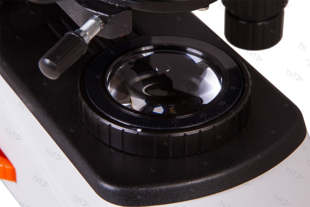 Система освещения расположена в нижней части микроскопа. Она состоит из светодиода мощностью 5 Вт, центрируемого конденсора Аббе с диафрагмой и откидным кольцом для фильтра и регулятора яркости подсветки, расположенного на корпусе. Для питания подсветки используется адаптер сети переменного тока.