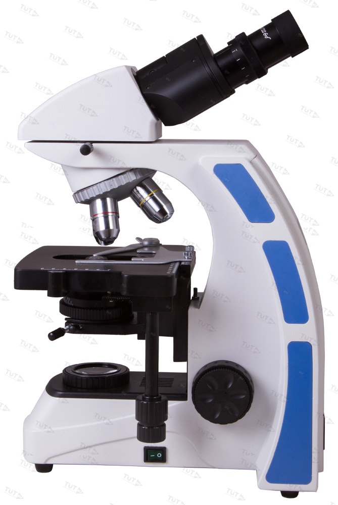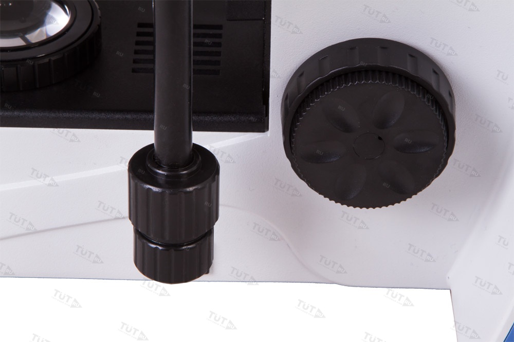 Визуальная насадка отклонена под углом в 30°, поэтому длительные наблюдения не приводят к перенапряжению мышц шеи и плечевого пояса. За настройку резкости изображения отвечают коаксиальные механизмы точной и грубой фокусировки – ручки расположены на корпусе. Микропрепараты фиксируются на механическом предметном столике, их положение под объективом удобно корректировать при помощи препаратоводителя.