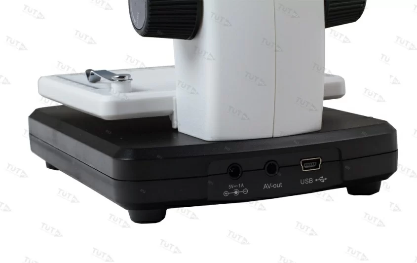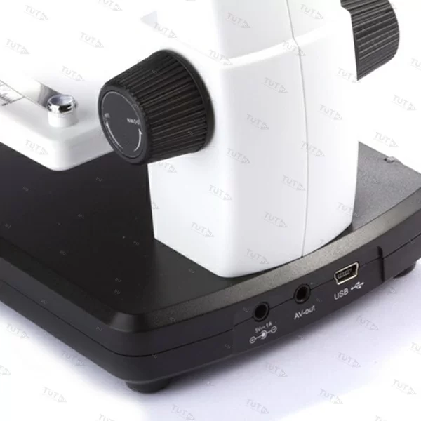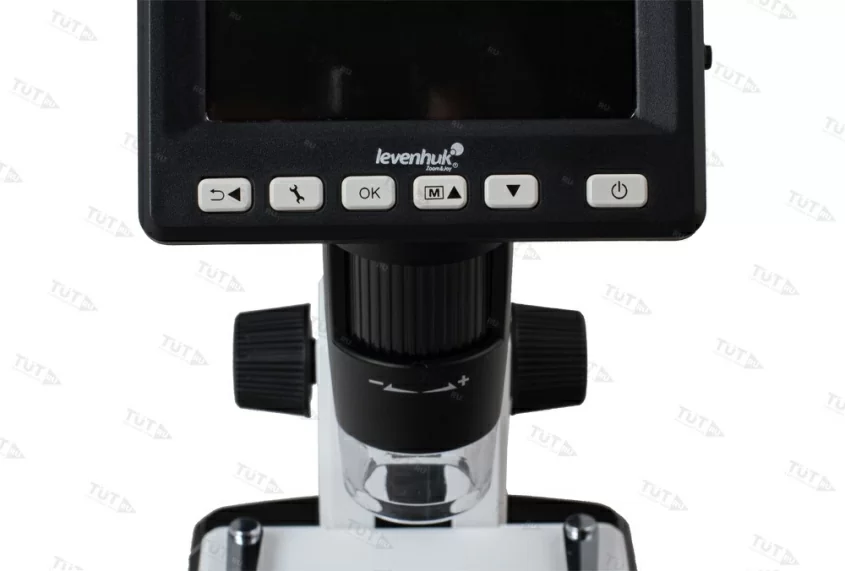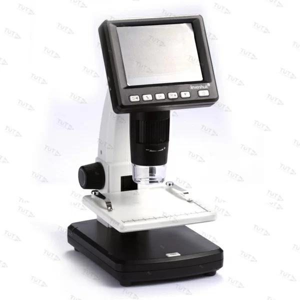 Цветной жидкокристаллический дисплей микроскопа имеет диагональ 3,5 дюйма. С помощью кнопок на корпусе можно регулировать яркость изображения, экспозицию и цветовой баланс. Микроскоп можно подключить к компьютеру с помощью стандартного кабеля USB и скопировать файлы с карты памяти. AV-выход позволяет выводить изображение из-под объектива микроскопа на телевизор или проектор в реальном времени.