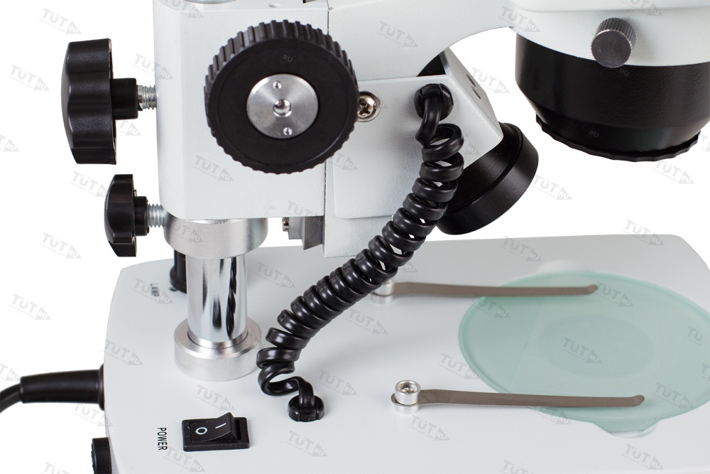 Микроскоп оснащен двумя осветителями, которые могут включаться как одновременно, так и по отдельности. Верхний предназначен для изучения предметов в отраженном свете, а нижний позволяет рассматривать полупрозрачные объекты (например, кристаллы, пластиковые детали и т.д.) в проходящем свете. В осветителях используются мощные галогенные лампы, их яркость может регулироваться, что позволяет подобрать оптимальные условия освещения для каждого объекта. Питание подсветки производится от электросети.