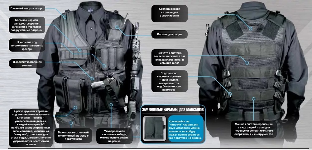 - Полный комплект подсумков: для магазинов, фонаря, рации или телефона, аптечки, пистолета и других принадлежностей