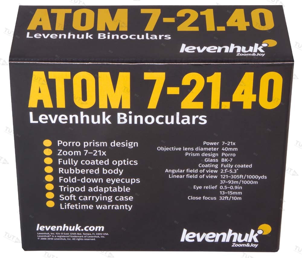 Levenhuk Atom 7–21x40 – качественный и надежный бинокль с переменной кратностью. Можно рекомендовать его охотникам и рыболовам, любителям страйкбола и спортивного ориентирования. Подойдет этот бинокль и для несложных астрономических наблюдений. Кратность прибора регулируется в пределах от 7 до 21x.