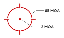 Multi-Reticle System™ - система сменных прицельных марок расширила спектр задач, позволяя вести темповой огонь по статичным и подвижным целям. Доступно три типа: «Круг» диаметром 65 МОА, «Точка» 2 МОА и совмещенный вариант «Круг с Точкой». По умолчанию установлен «круг с точкой, для смены типа необходимо зажать клавишу с знаком «минус» и удерживать на протяжении 3 секунд. Внести поправки на дальность и можно при помощи механизма выверки с шагом ½ МОА, запас хода 50 МОА.