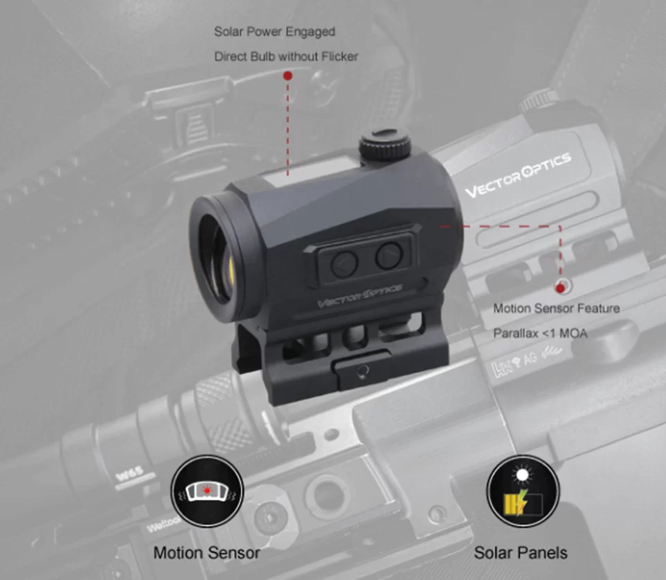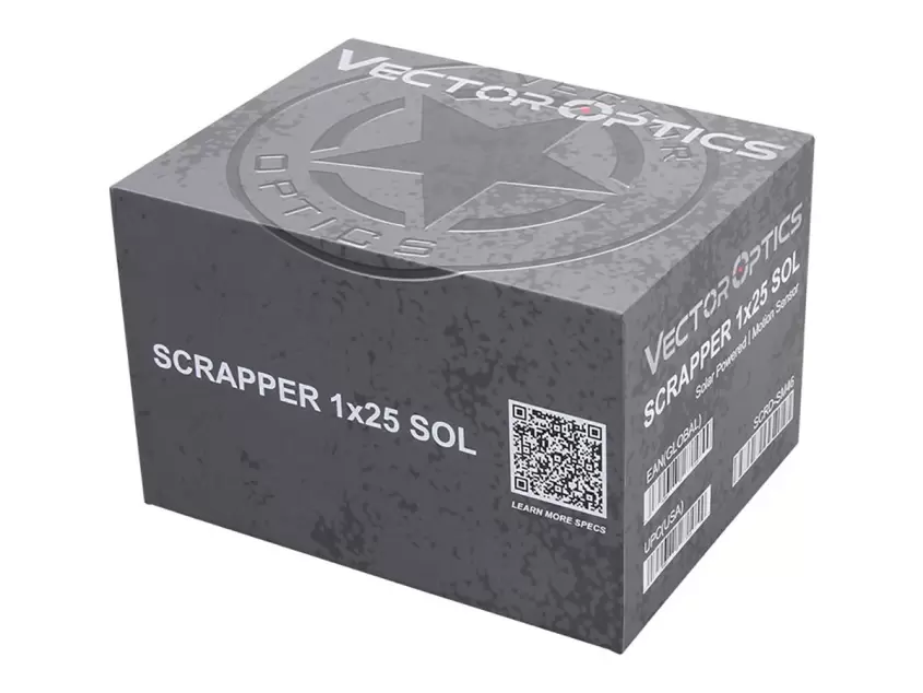 Vector Optics Scrapper 1x25 SOL - коллиматорный прицел закрытого типа с креплением на планки Вивера. Особенностью этой модели является дублированная система энергоснабжения с батареей CR2032 и небольшой солнечной панелью, которая обеспечивает питание устройства при ярком освещении. Прицел создавался в качестве эффективного инструмента для тактических видов стрельб по статичным и подвижным целям на коротких дистанциях CQB (Close Quarters Battle). Также эту модель можно эффективно применять на загонных типах охот, во время спортивной или развлекательной стрельбы. Пользователям доступен выбор из трех прицельных марок. Данный коллиматор можно использовать совместно с приборами ночного видения (ПНВ). Встроенный сенсор движения автоматически активирует прицел, как только Вы возьмете оружие в руки, и выключит его после непродолжительного простоя. Коллиматорный прицел Vector Optics Scrapper 1x25 SOL получает только позитивные отзывы от своих владельцев. Оптика полностью герметична и не боится прямого погружения в воду. Прочный алюминиевый корпус с легкостью держит отдачу оружия с дульной энергией выстрела до 6000 Дж.