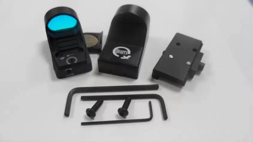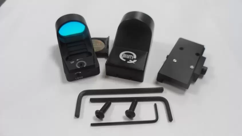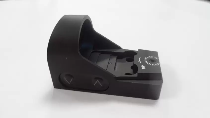 Коллиматор получил новый блок управления подсветкой, включающий 10 градаций яркости. Регулировка осуществляется вручную с помощью кнопок со схематичным отображением стрелок "вверх" и "вниз", что означает увеличение или снижение яркости. Внимание: подсветка включается нажатием и удержанием стрелки "вверх". Нажатие и удержание стрелки "вниз" отключает подсветку.