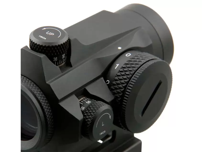 Калибровка прицельной марки осуществляется с помощью регулировочных барабанчиков открытого типа. Цена клика равна одной угловой минуте (МОА). Диапазон ввода по ветру и расстоянию в пределах свыше 100 МОА позволяет настроить точку попадания на необходимую дистанцию. Размещение в V-образной нише защищает от неожиданного смещения при непреднамеренном контакте. На барабанчиках имеется градуировка, при повороте хорошо слышны щелчки.