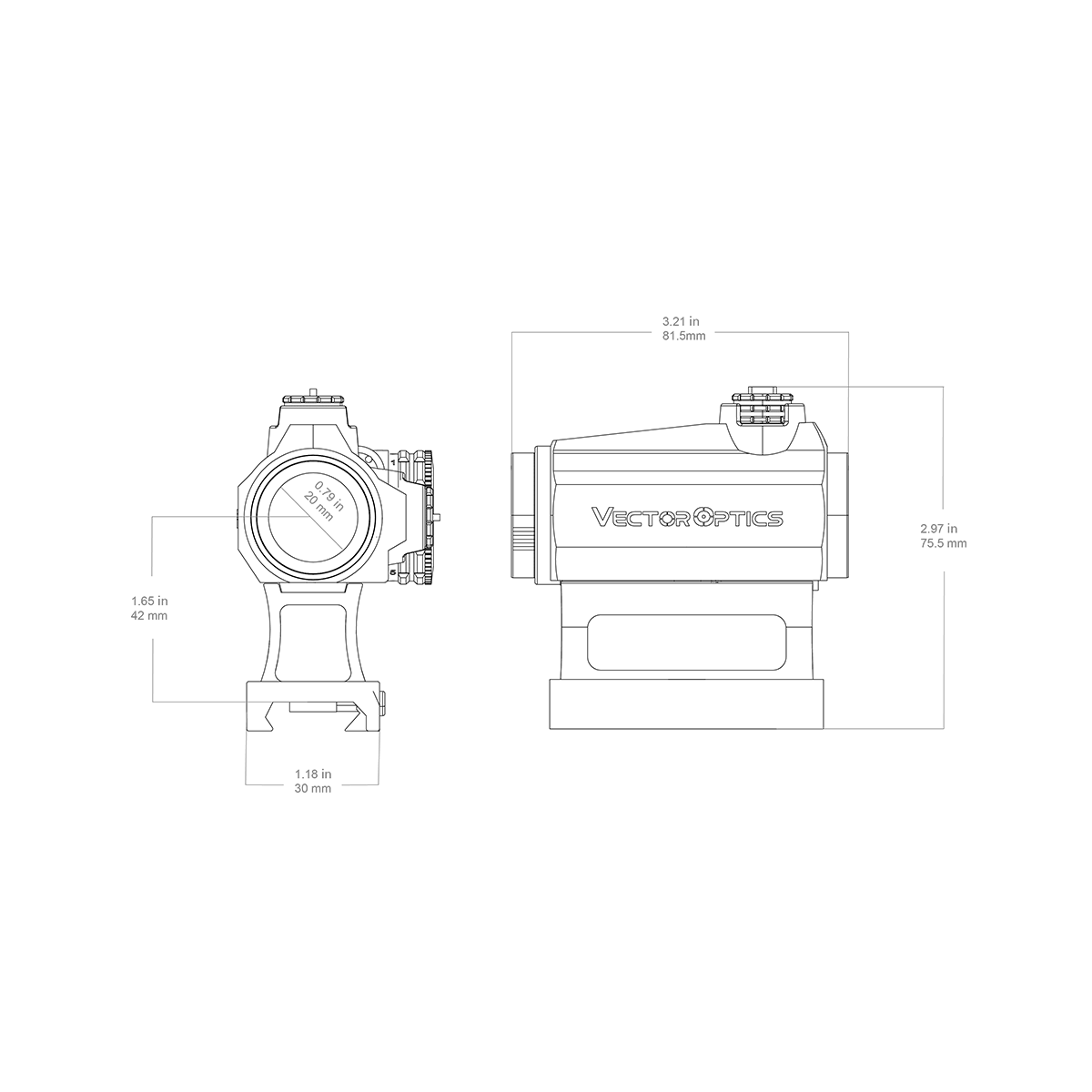 Два варианта установки на планку Picatinny. Высокое крепление скелетного типа облегчает общий вес конструкции и в ряде случаев позволяет пользоваться штатными мушкой и целиком. Расстояние от планки до оптической оси коллиматора на высоком кронштейне — 40,6 мм. Низкий кронштейн (1/3) хорош для максимально близкой установки прицела к стволу. Оба крепления фиксируются на планке стандартным винтом с внутренним шестигранником (не быстросъём).