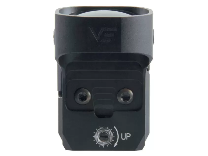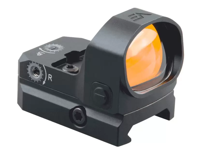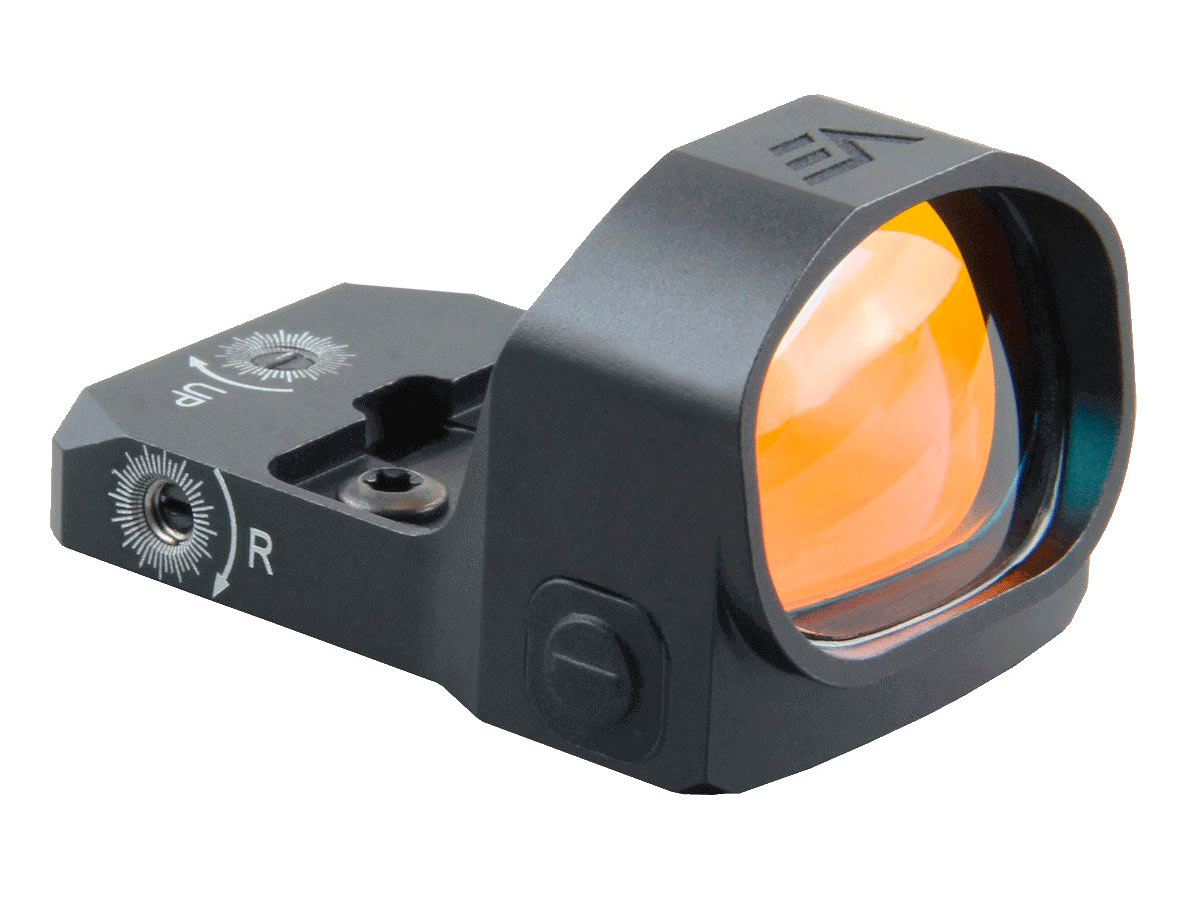 Красная «точка» 3 MOA. Автовыключение питания. Для ввода поправок и корректировки СТП используются два винта под плоскую мини-отвёртку. Яркость метки регулируется вручную, кнопками «+/-» по бокам корпуса. Доступно 8 уровней для стрельбы при дневном свете и 2 уровня для сумерек и совместной эксплуатации с ПНВ. Включается сетка мгновенно, за 1 секунду, а выключается либо принудительно, длительным нажатием кнопки «-», либо автоматически после 4 часов бездействия. Для питания нужна 1 батарейка CR2032, которой при среднем уровне яркости «5» хватает минимум на 5 лет непрерывной работы.