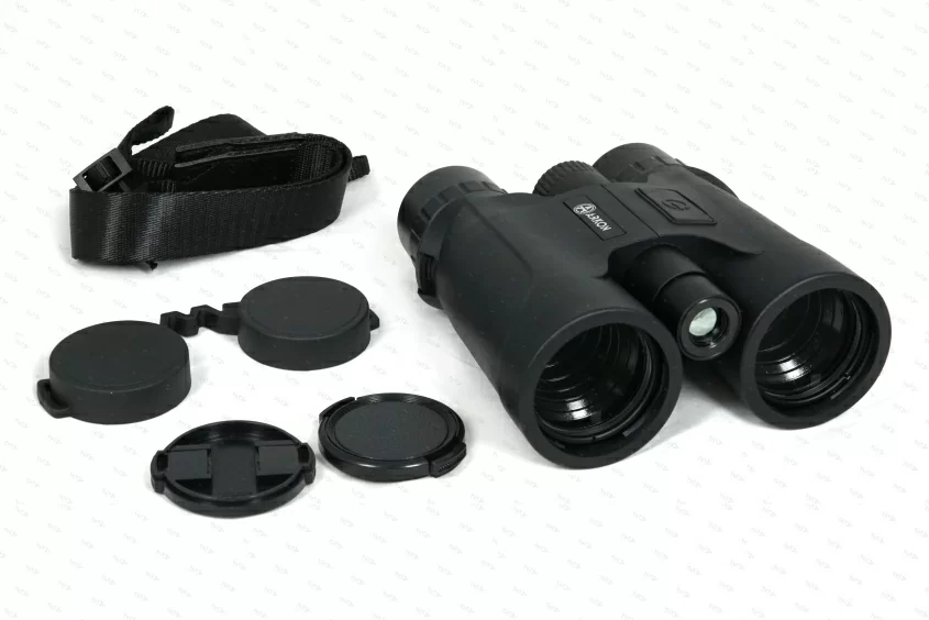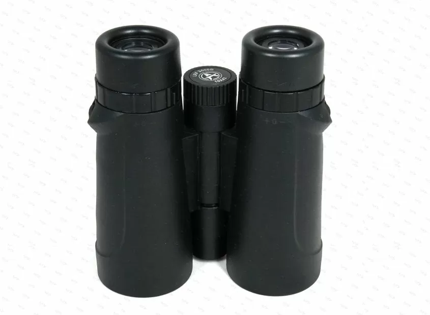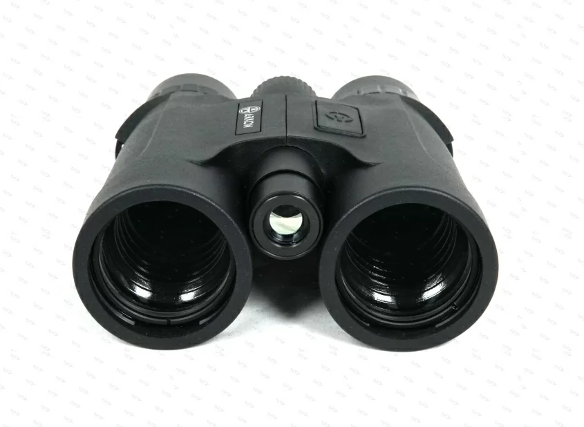 Оптическая схема бинокля с дальномером построена на качественных призмах Руф, выполненных из премиального стекла марки ВК7. В дополнение имеется многослойное просветляющее покрытие, которое значительно увеличивает светопропускную способность. Диаметр объективов 42 мм, оптическое увеличение 10 крат. Показатель угла пространственного зрения FOV 7° предоставит для видимости область пространства шириной 122 метра на удалении в один километр. Центральный барабан фокусировки расположен между окулярами.