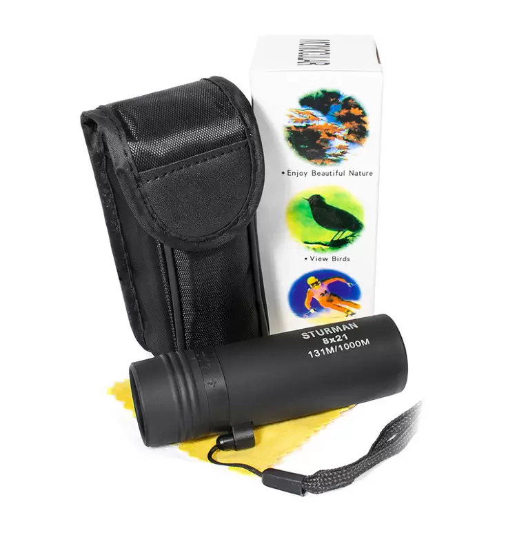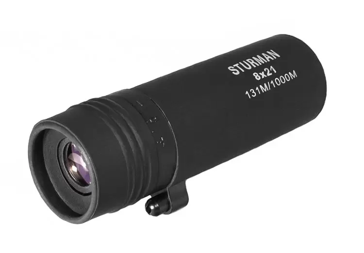 Основное назначение монокуляра Sturman 8x21  Небольшой монокуляр Sturman 8x21 - прекрасный оптический инструмент, обладающий восьмикратным увеличением и диаметром объектива равным 21 миллиметрам. Оптическая схема прибора построена с применением Roof призм, которые оборачивают изображение в правильную сторону и увеличивают фокусное расстояние. При своих небольших размерах этот монокуляр обладает хорошими оптическими данными, позволяющими комфортно пользоваться прибором как в помещениях, так и на открытом воздухе. Монокуляр Sturman 8x21 - это прекрасное приобретение для людей, любящих посещать театры, музеи, всевозможные выставки, а также спортивные мероприятия. Кроме того, по достоинству оценить высокие качества оптики могут также туристы, любители рыбалки и охоты. Монокуляр чрезвычайно прост в обращении и неприхотлив в обслуживании. Он легко поместится в нагрудном кармане любой куртки, дорожной сумке или бардачке автомобиля. Основные характеристики монокуляра Sturman 8x21   Обрезиненное, абсолютно нескользкое покрытие корпуса  Стекла монокуляра имеют просветляющее покрытие Оптическая схема на Roof призмах, оборачивающих изображение Плавный механизм фокусировки при помощи поворота окуляра В комплекте поставки имеется ремешок на запястье, чехол для транспортировки и хранения  Конструктивные особенности монокуляра Sturman 8x21  Монокуляр Sturman 8x21 выполнен в прочном обрезиненном корпусе из алюминиевого сплава. Влагозащитное покрытие не только оберегает оптику от прямого попадания влаги и пыли, но и позволяет пользоваться прибором при небольших атмосферных осадках. Монокуляр удобно ложиться в любую руку. Для удобства переноски и наблюдения можно воспользоваться ремешком, который легко одевается на запястье. Высокое качество передаваемого изображения удаленных объектов обеспечивается конструктивными особенностями прибора и просветляющим покрытием всех оптических элементов. Каринка даже сильно удаленного объекта получается высококонтрастной и насыщенной с полной цветопередачей.Удобный механизм фокусировки, приводимый в движение поворотом окуляра, позволяет следить даже за движущимися целями, не говоря уже о статичных. Узнать больше о технических характеристиках и основных конструктивных особенностях монокуляра Sturman 8x21 можно у менеджеров нашего интернет-магазина по телефону (495) 989-10-56. Также вы можете оставить свой вопрос на сайте, заполнив небольшую форму, и мы вам обязательно ответим в кратчайшие сроки. Комплект поставки монокуляра Sturman 8x21  В комплекте поставки находится: монокуляр, ремешок на запястье, руководство по эксплуатации, футляр для транспортировки и хранения, а также салфетка для протирки оптики, гарантийный талон. Технические характеристики монокуляра Sturman 8x21    Основные ТТХ   Sturman 8x21     Оптическая схема  Призмы Roof   Оптические характеристики   Увеличение, x 8   Световой диаметр объектива, мм 21   Поле зрения, °  7,5   Поле зрения, м. на 100м. 131   Физические и эксплуатационные характеристики   Материал линз стекло   Материал корпуса  Алюминиевый сплав   Покрытие корпуса  Обрезиненное   Габаритные размеры (ДхШхВ), мм  165 х 80 х 62   Производитель может вносить изменения в комплектацию, конструкцию и/или программное обеспечение прибора без предварительного уведомления пользователей