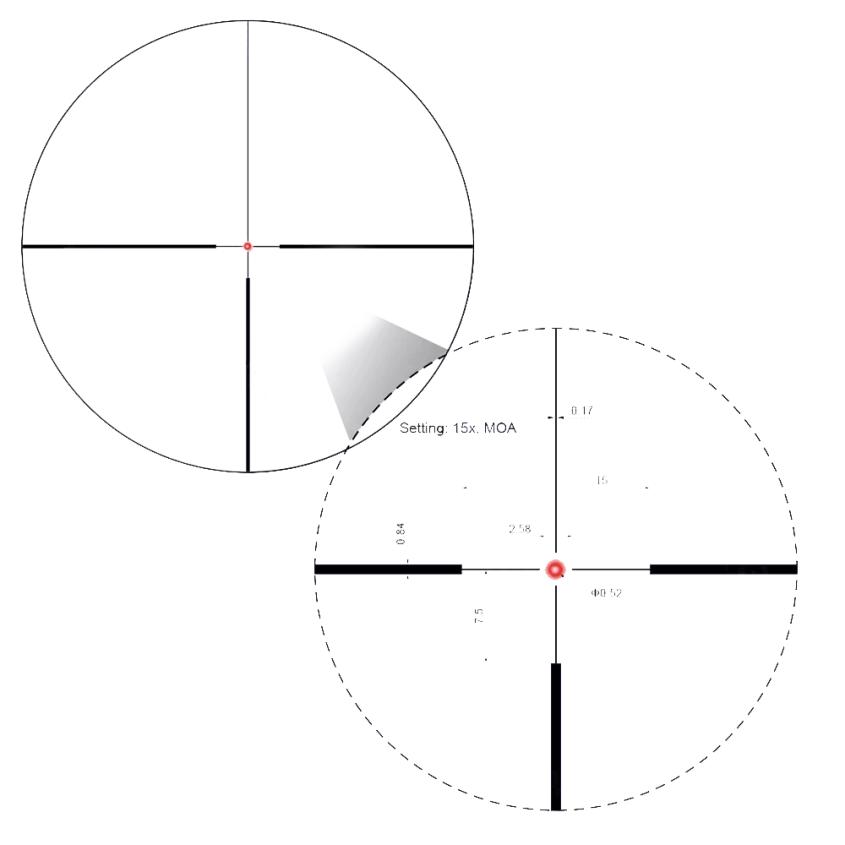 SFP Fiber – классическая прицельная сетка во второй фокальной плоскости (SFP) с оптоволоконной подсветкой, которая обеспечивает чёткую точку прицеливания в разных условиях освещённости.