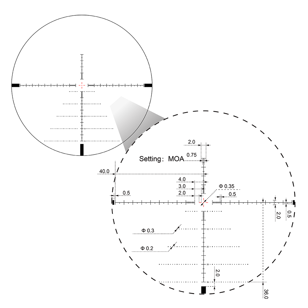 Прицельная сетка VSE-3 MOA, расположенная в первой фокальной плоскости, изменяет свой масштаб пропорционально кратности. Информативная разметка по обеим осям, а также дополнительная вертикальная "ёлочка" позволяют быстро вносить поправки при стрельбе выносом.
