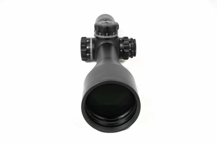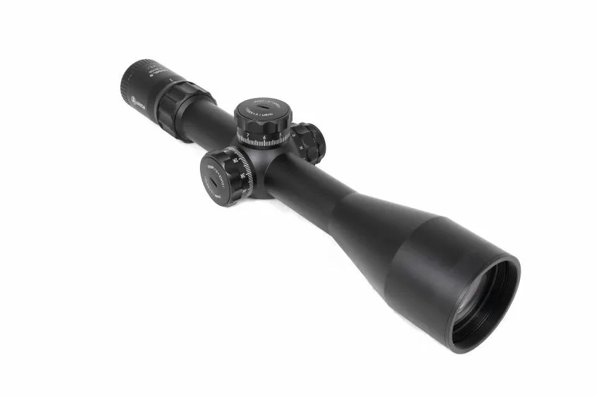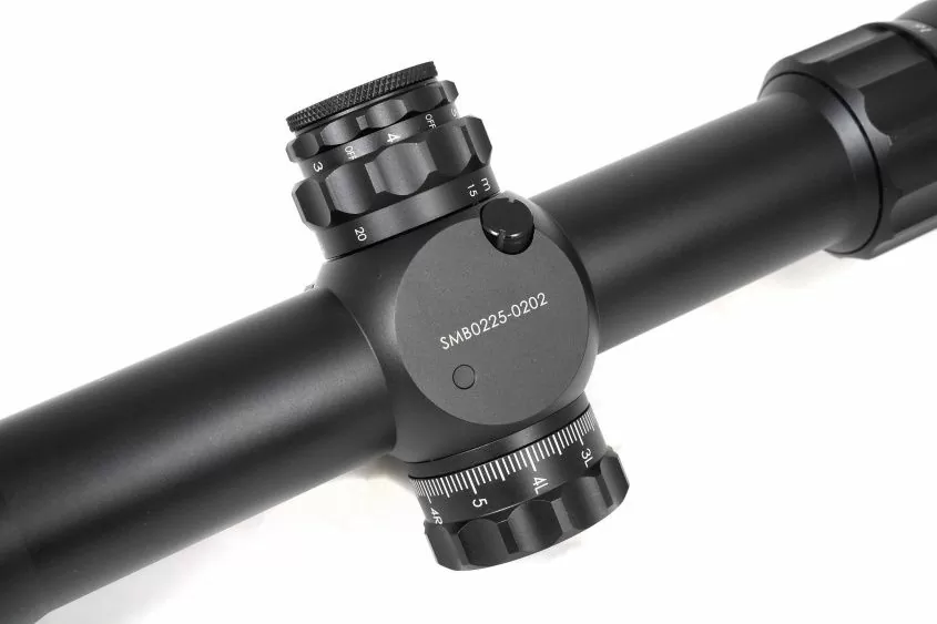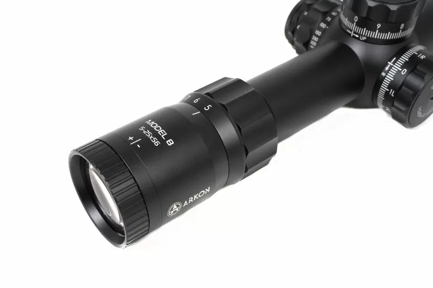 Диапазон оптического увеличения от 5 до 25 крат отлично подходит для стрельбы на средних и дальних дистанциях. Все оптические элементы изготовлены из премиальных марок ED-стекол с низким уровнем дисперсии. На поверхности линз нанесено многослойное просветляющее покрытие FMC, обеспечивающее возможность для комфортного применения в условиях с низким уровнем освещенности. Окулярная точка вынесена на расстояние 94 мм. Диаметр выходного зрачка изменяется от 11,2 до 2,4 мм в зависимости от увеличения. Угол пространственного поля зрения FOV (Field of view) имеет значение 4,7° - 0,936° (на мин и макс кратности), в линейном выражении это соответствует области пространства размером 8,2 - 1,6 метров на удалении в 100 м. Окулярный узел оснащен механизмом быстрой фокусировки.