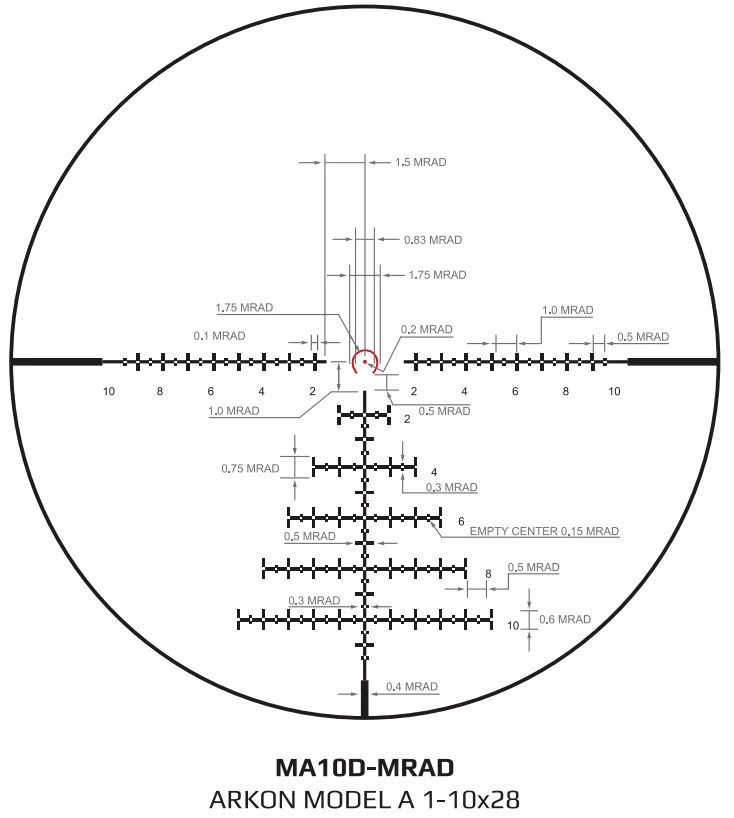 Баллистическая сетка MA10D-MRAD нанесена на стекло методом лазерной гравировки и расположена в первой фокальной плоскости (FFP), благодаря чему сохраняет точные угловые пропорции независимо от выбранного увеличения. Это позволяет эффективно использовать вынос точки прицеливания и уверенно стрелять по удаленным целям. Расширенная разметка нижнего поля сетки дает возможность компенсировать падение пули и рассчитывать упреждение при стрельбе по движущимся объектам. Многоуровневая система подсветки центрального фрагмента гарантирует отличную видимость при любом уровне освещения.