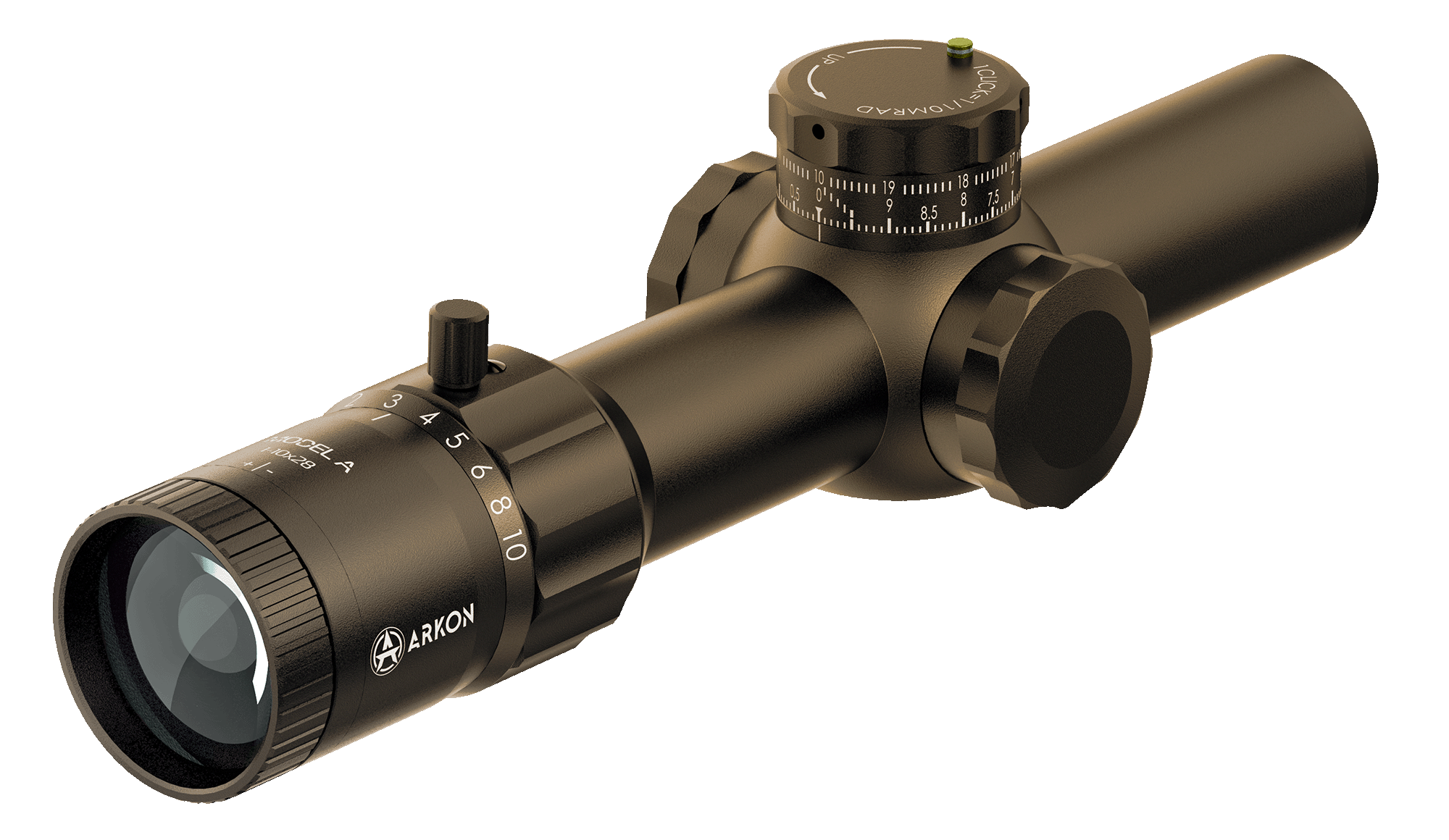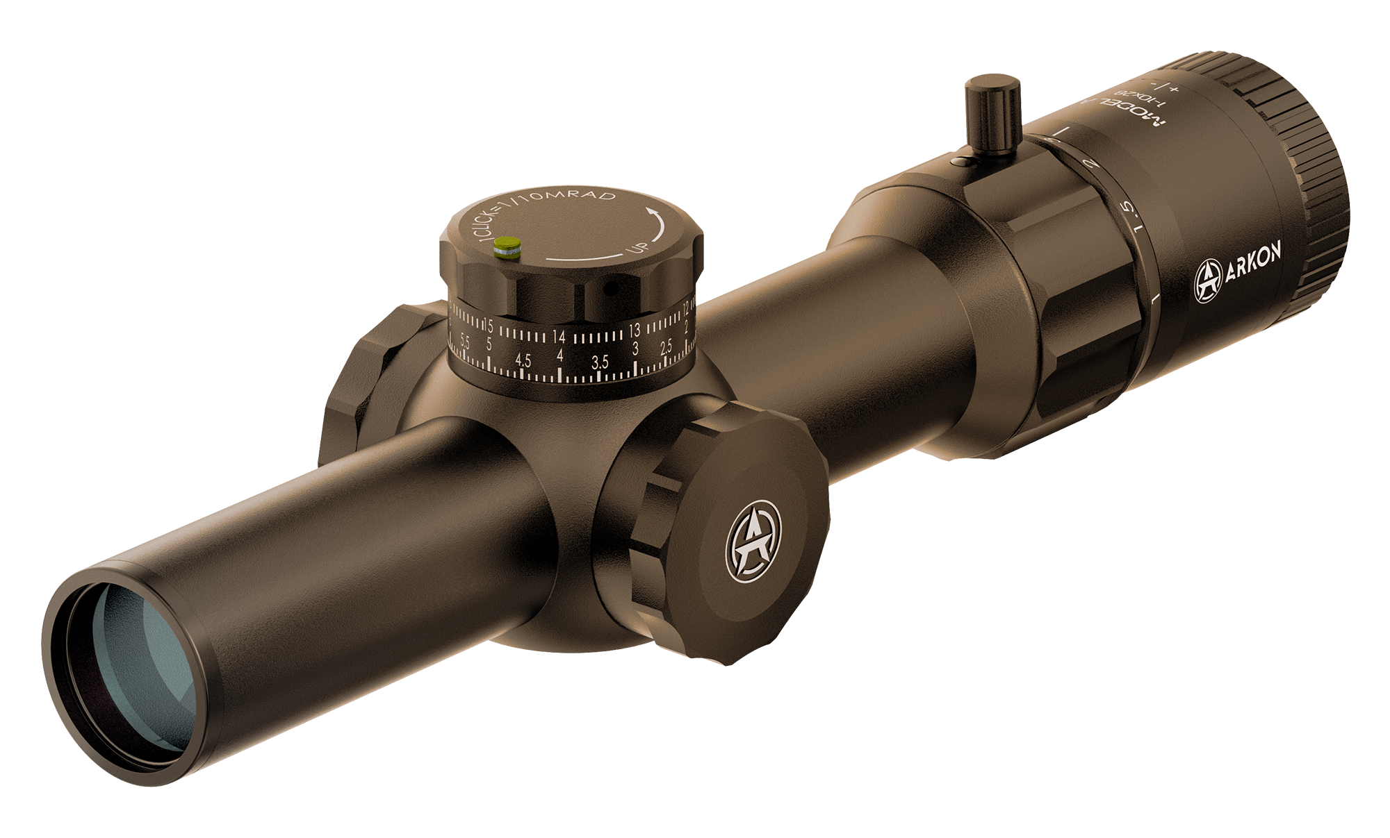 В оптической системе Arkon Model A 1-10х28 используются линзы из премиальных ED стекол с крайне низким уровнем дисперсии, что минимизирует хроматические аберрации и повышает четкость изображения. Многослойное просветляющее покрытие FMC значительно улучшает светопропускание, позволяя получать яркую, детализированную картинку с максимально естественной цветопередачей. Вынос выходного зрачка составляет 102 мм, благодаря чему стрелок может вести огонь, не приближая глаз вплотную к окуляру, что особенно важно при стрельбе с оружия крупных калибров. Поле зрения на дистанции 1000 м составляет 389 м на минимальной кратности и 38 м на максимальной. Окуляр оснащен удобным механизмом регулировки кратности, а специальный упор позволяет манипулировать настройки одним пальцем, не обхватывая корпус окуляра рукой.