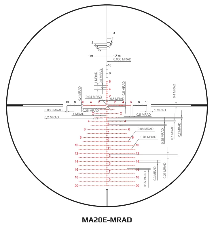 Оптический прицел Arkon Model A 6-36х56 оснащен баллистической сеткой MA20E-MRAD, выполненной методом лазерной гравировки на стекле и расположенной в первой фокальной плоскости (FFP). Благодаря такой конфигурации все угловые интервалы между делениями сетки остаются постоянными на любом увеличении, что позволяет стрелку уверенно работать выносом и корректировать огонь на дальних дистанциях. Расширенная шкала по вертикали и горизонтали облегчает расчет упреждений при боковом ветре и компенсацию траектории пули. Сетка имеет подсветку с десятью уровнями яркости, управление которой осуществляется боковым барабаном. Питание подсветкой реализовано от батарейки CR2032.
