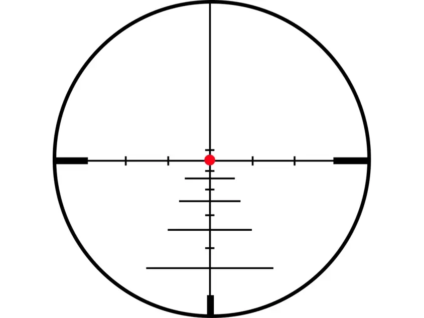 Визирная сетка Ballistic-550 выгравирована во 2-й фокальной плоскости и содержит ряд прицельных меток, соответствующих разным дистанциям для стрельбы. Центральная точка подсвечивается двумя цветами – красным или синим, есть возможность выбора одного из 5 уровней яркости. Максимальная дальность стрельбы с поправками по сетке Ballistic-550 – 0.5 км или 550 ярдов.