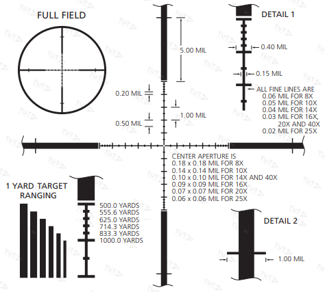 В оптическом прицеле Leupold Mark 4 LRT 8.5-25x50 используются тактические барабанчики M1 позволяющие вводить поправки одним пальцем с шагом в ¼ МОА в диапазоне 72 МОА и возможностью быстрого обнуления настроек. Для точного определения дальности в независимости от увеличения визирная сетка расположена на первой фокальной плоскости, что позволяет изменяться размерам сетки вместе со сменой кратности.