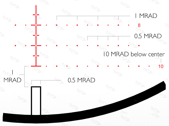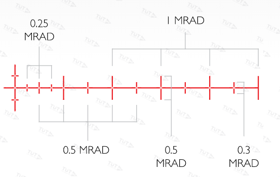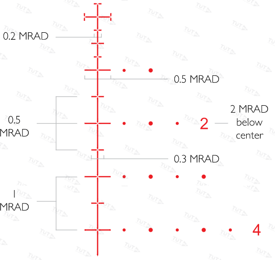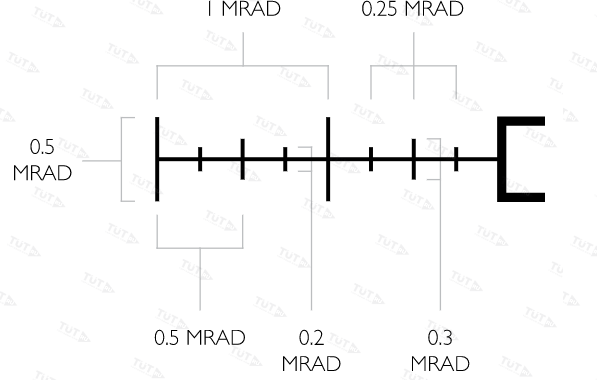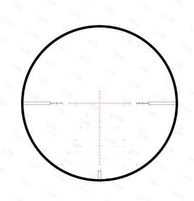 Прицельная сетка MilProрасположена впервой фокальной плоскости. Это тактический, масштабируемыйвариант, являющийся аналогом распространенного «Хорус» (снайперская сетка). Маркировка в тысячных дистанции понравится стрелкам высокоточникам.Для «снайпинга» по крупным представителям животного мира и минимизации количества промахов на охоте рекомендовано воспользоваться боковой отстройкой от параллакса (от 14 м до ∞). Идеально настроить изображение поможетдиоптрийная корректировка окуляра.